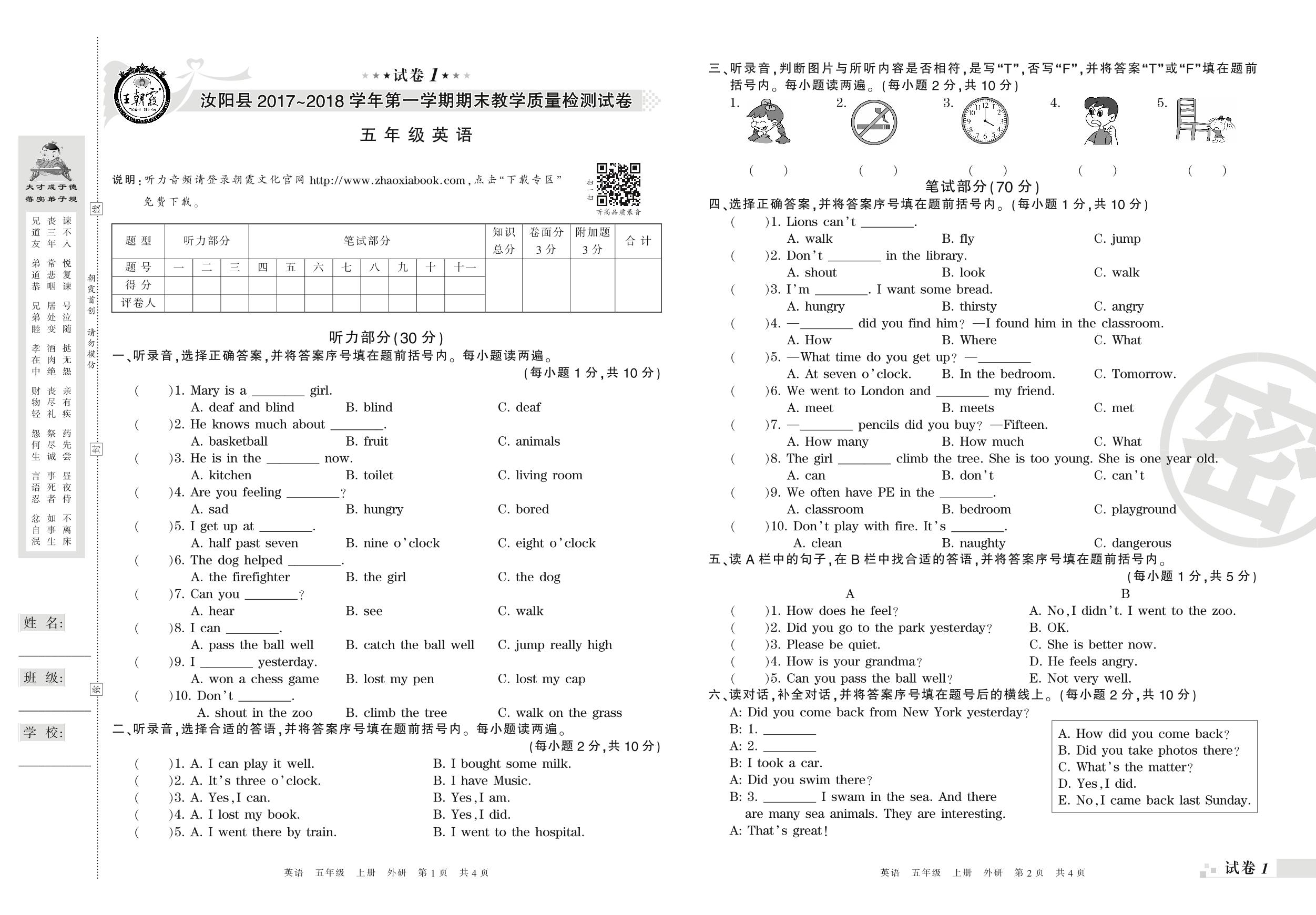 2017-2018学年第一学期洛阳市汝阳县五年级英语试卷(外研版)【1】