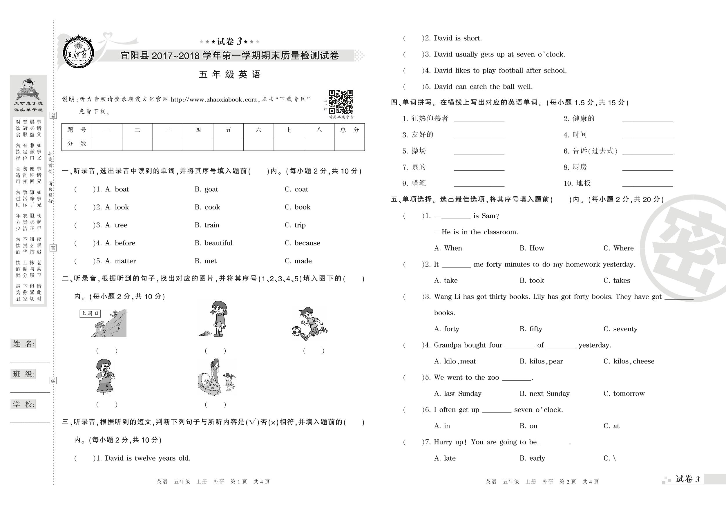 2017-2018学年第一学期洛阳市宜阳县五年级英语试卷(外研版)【3】