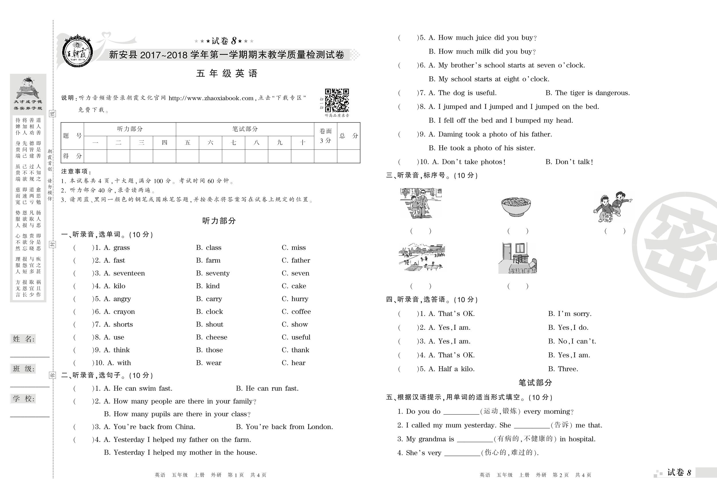 2017-2018学年第一学期新安县五年级英语试卷(外研版)【8】