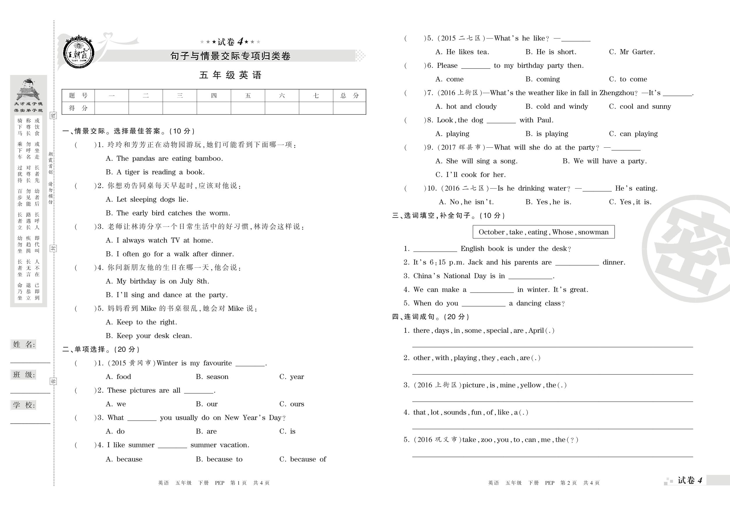 王朝霞期末专项卷——句子与情景交际专项归类卷五年级下册英语(PEP版)【4】