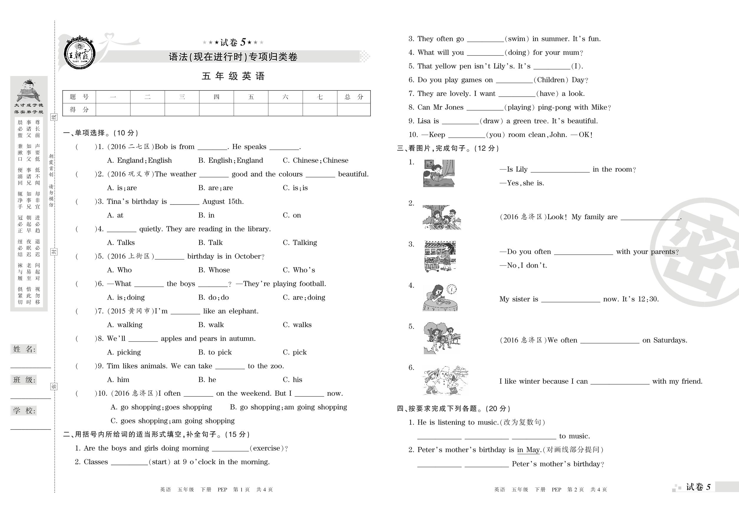王朝霞期末专项卷——语法(现在进行时)专项归类卷五年级下册英语(PEP版)【5】