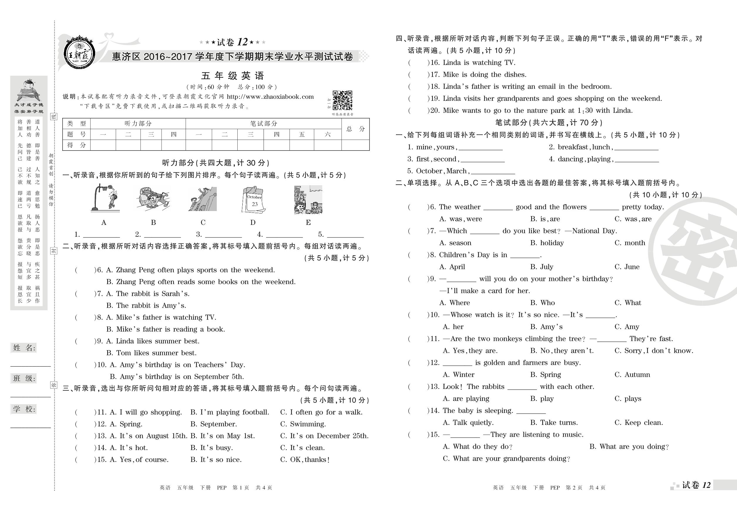 2016-2017学年第二学期郑州市惠济区五年级英语试卷(PEP版)【12】