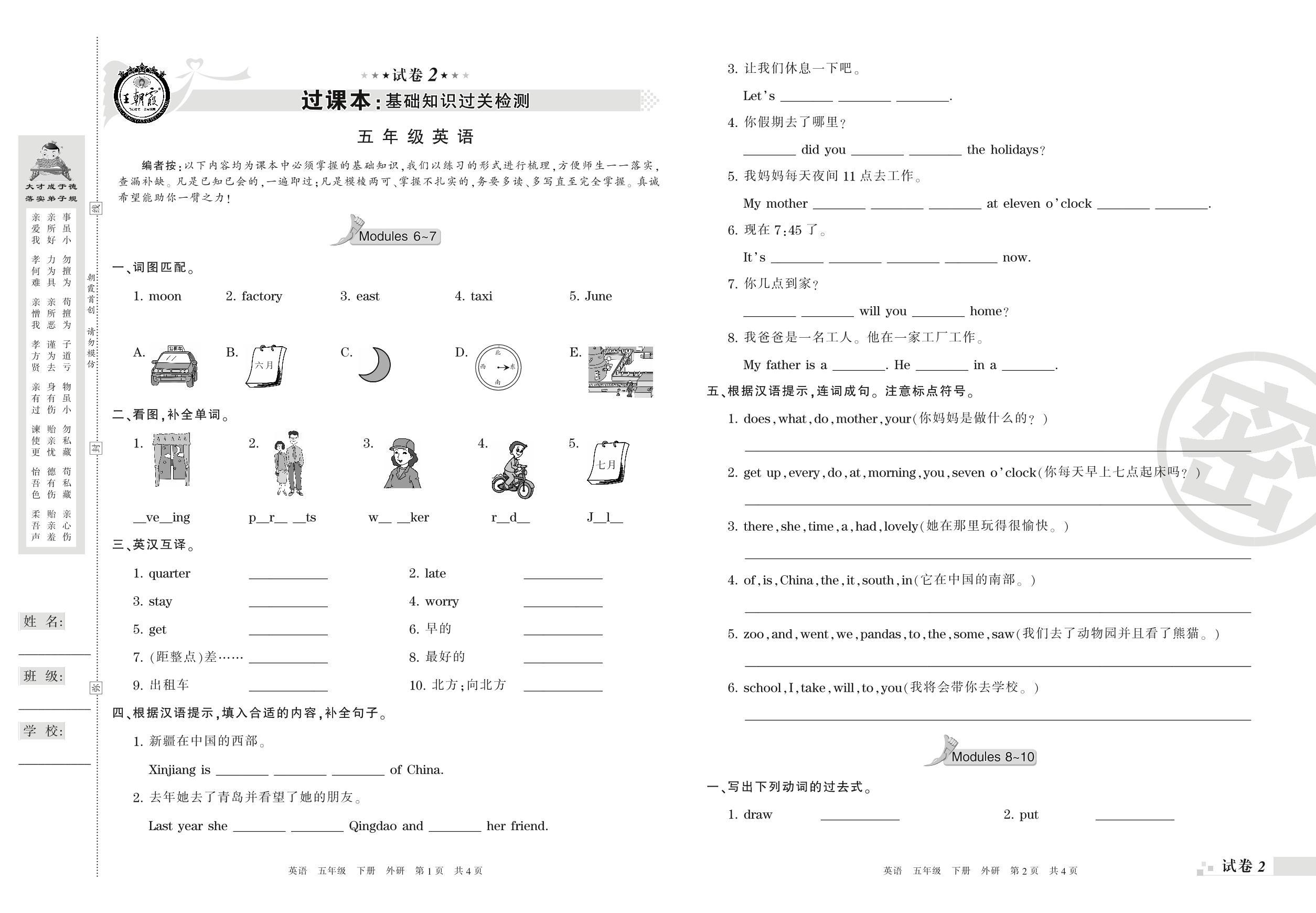 王朝霞期末过课本:基础知识过关检测五年级下册英语(外研版)【2】