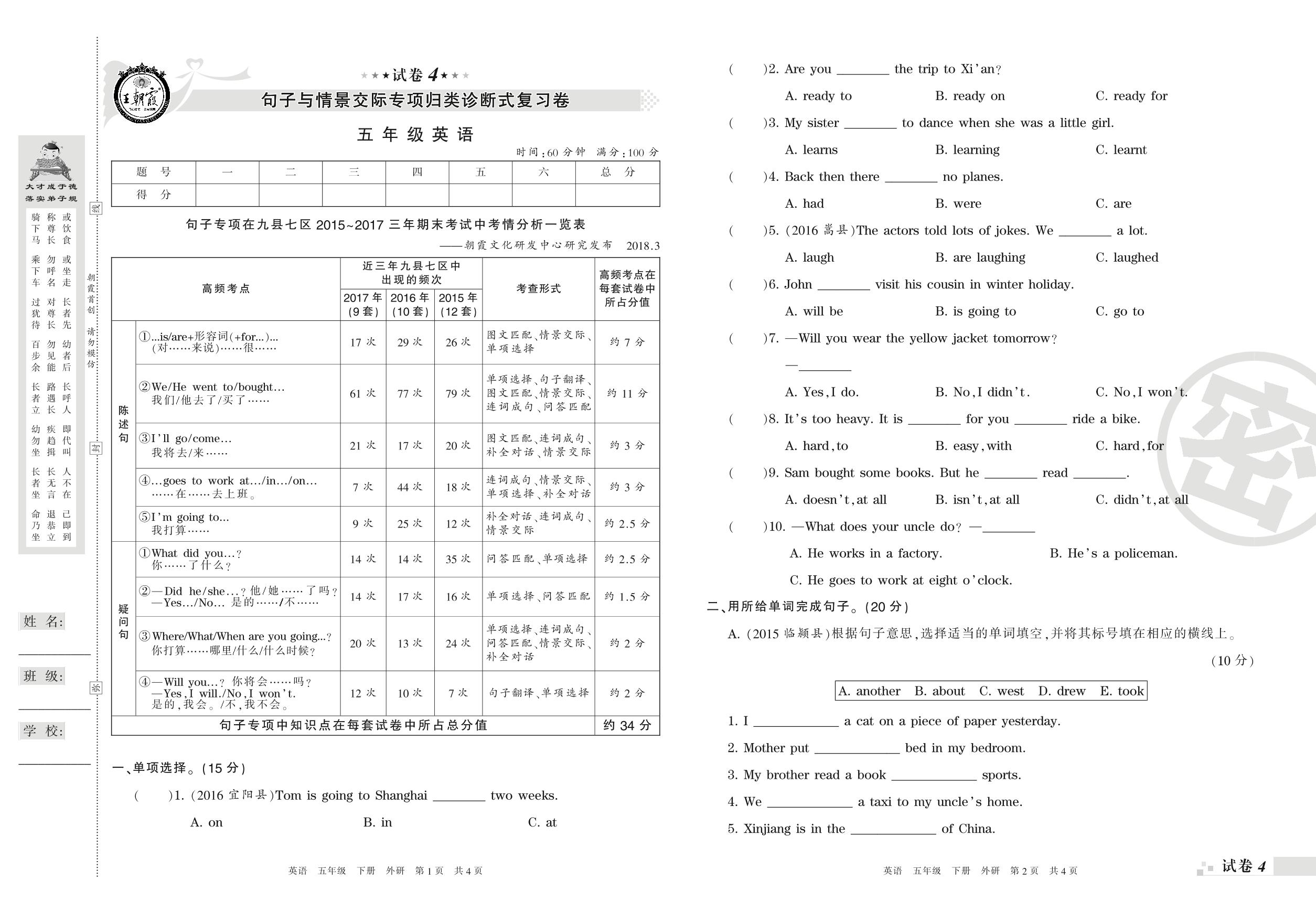 王朝霞期末专项卷——句子与情景交际专项归类诊断式复习卷五年级下册英语(外研版)【4】