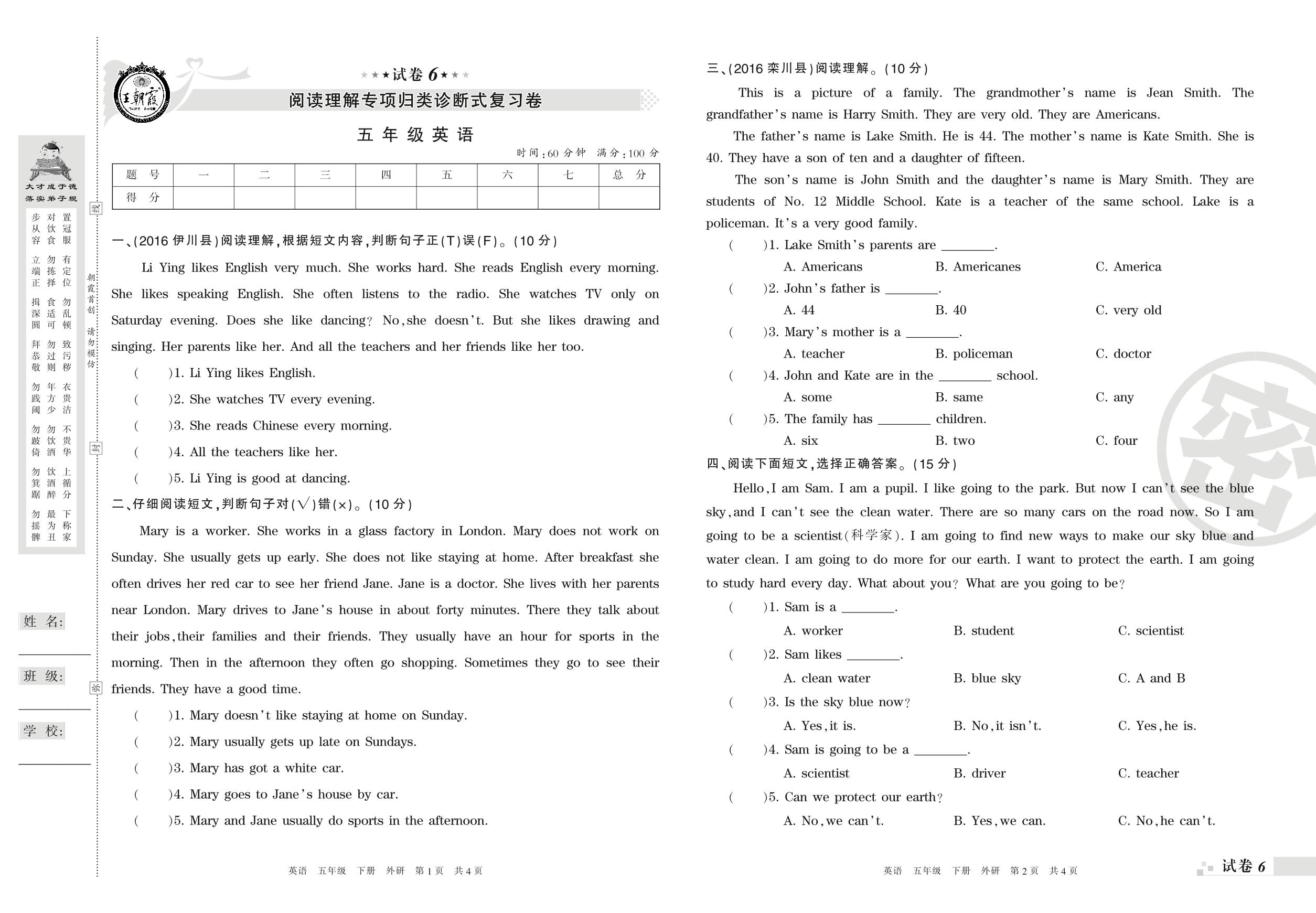 王朝霞期末专项卷——阅读理解专项归类诊断式复习卷五年级下册英语(外研版)【6】