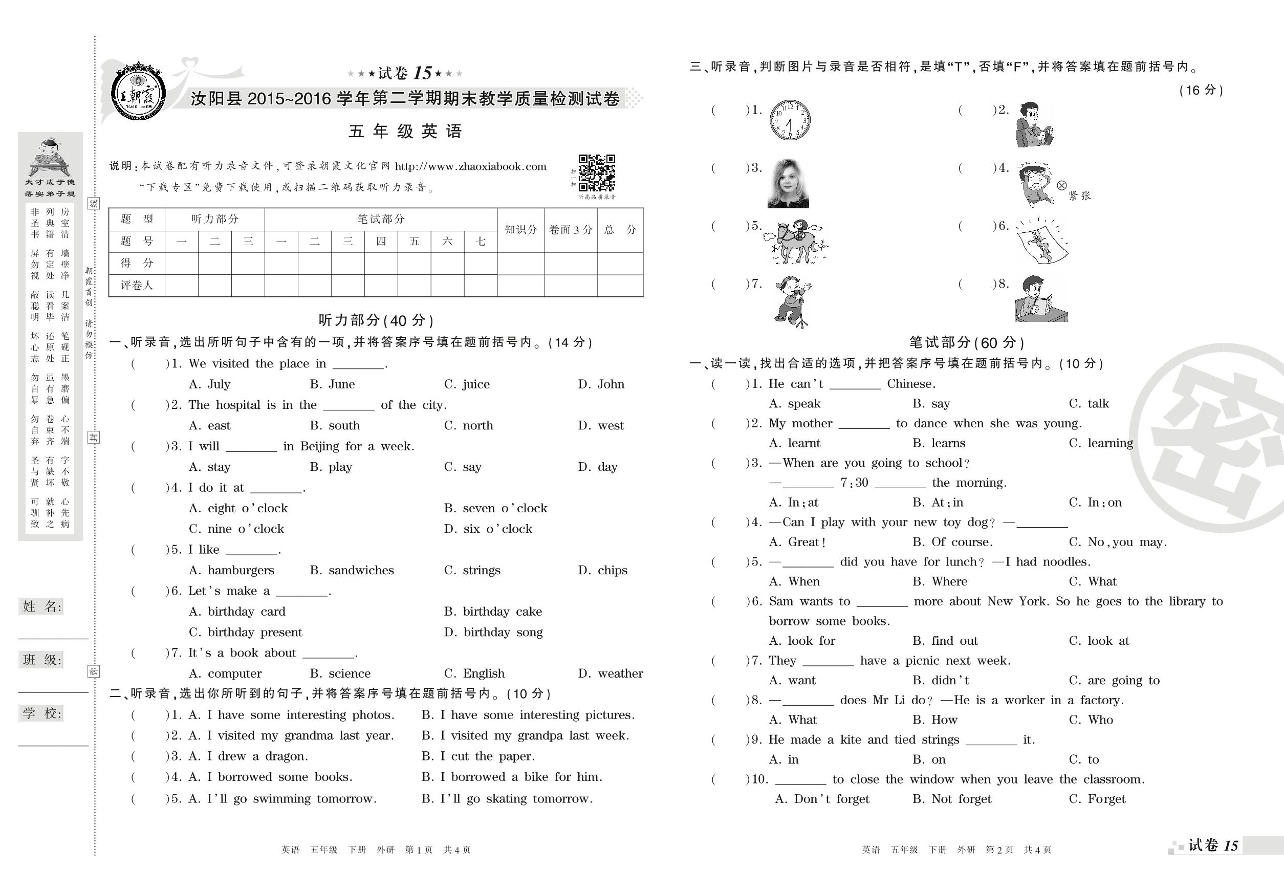 2015-2016学年第二学期洛阳市汝阳县五年级英语试卷(外研版)【15】