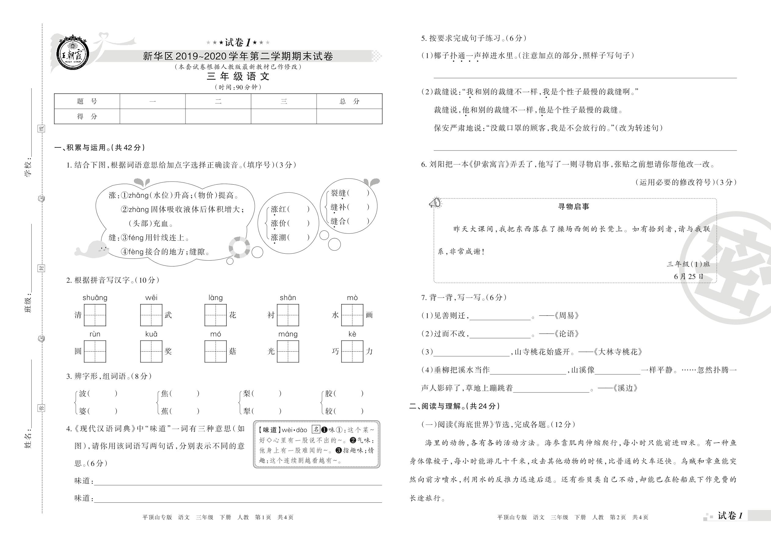 三年级语文人教版下册期末卷