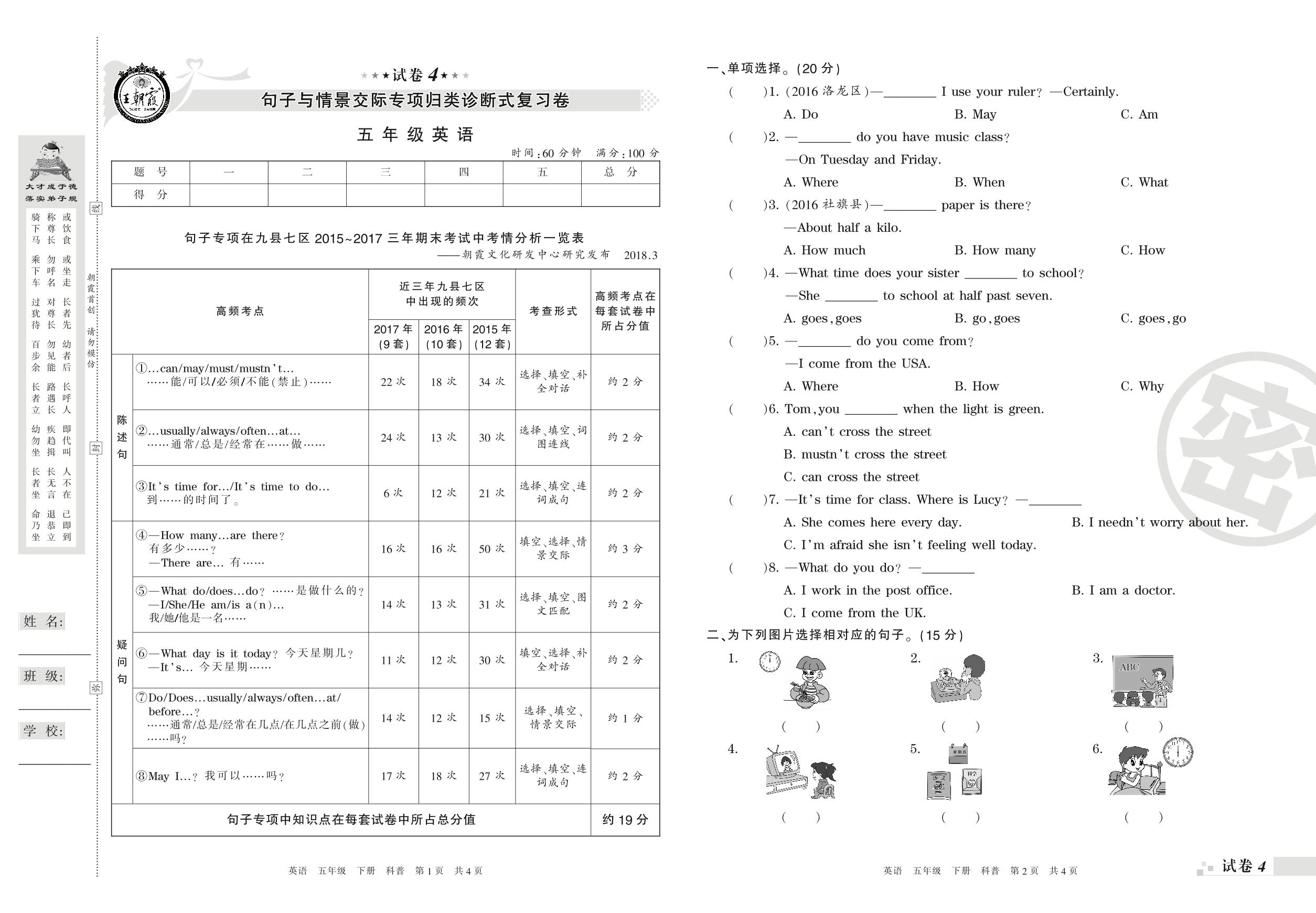 王朝霞期末专项卷——句子与情景交际专项归类诊断式复习卷五年级下册英语(科普版)【4】