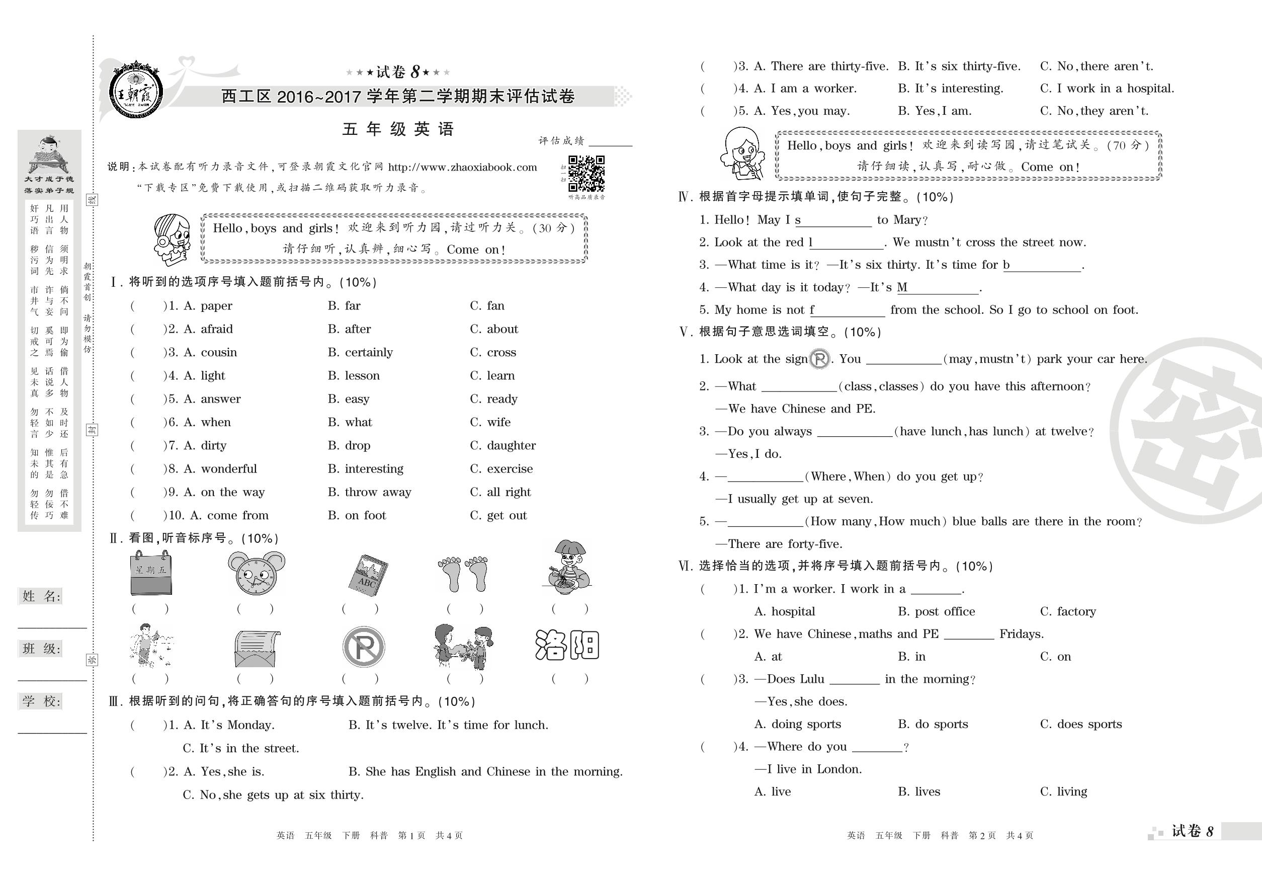 2016-2017学年第二学期洛阳市西工区五年级英语试卷(科普版)【8】