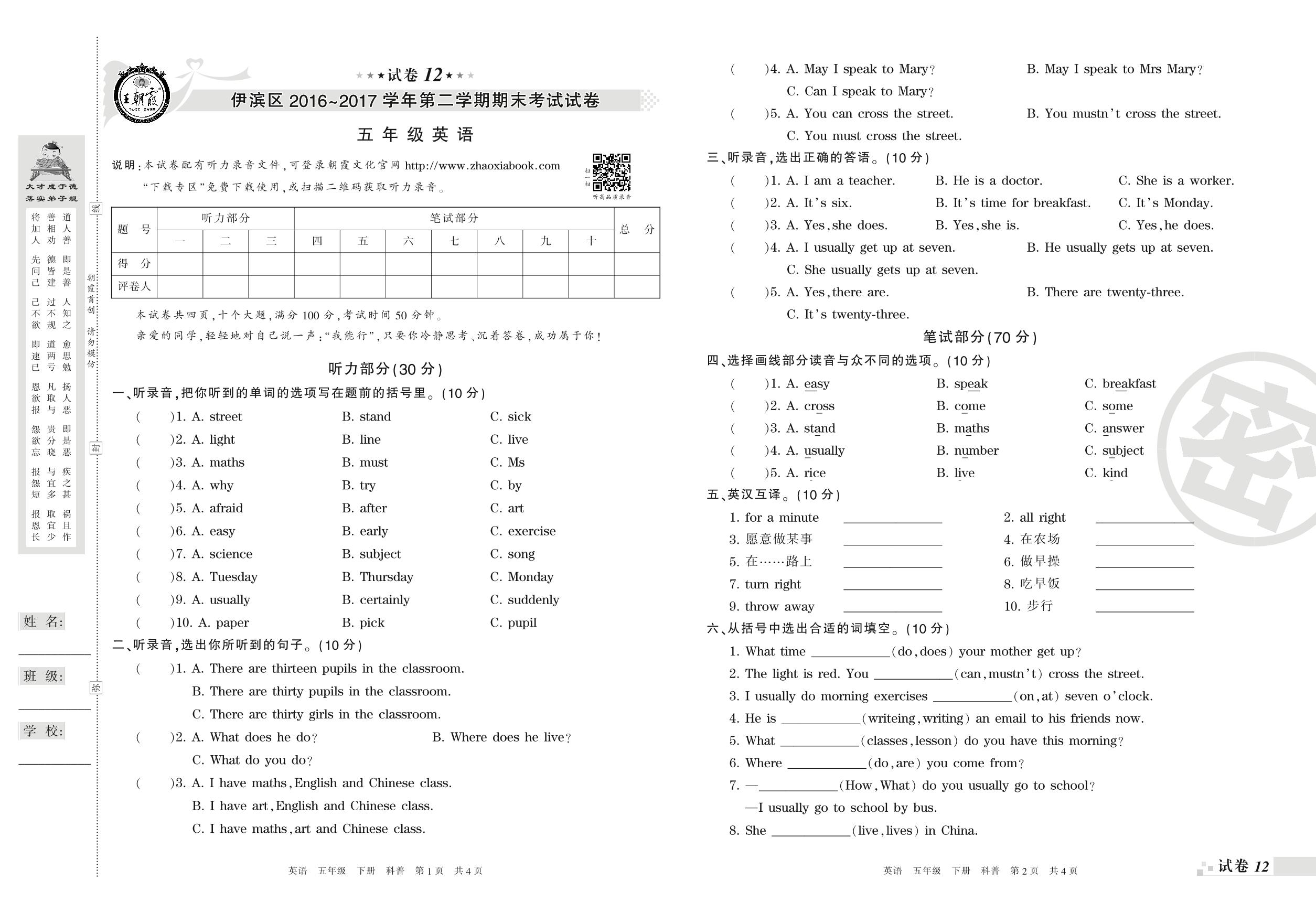 2016-2017学年第二学期洛阳市伊滨区五年级英语试卷(科普版)【12】