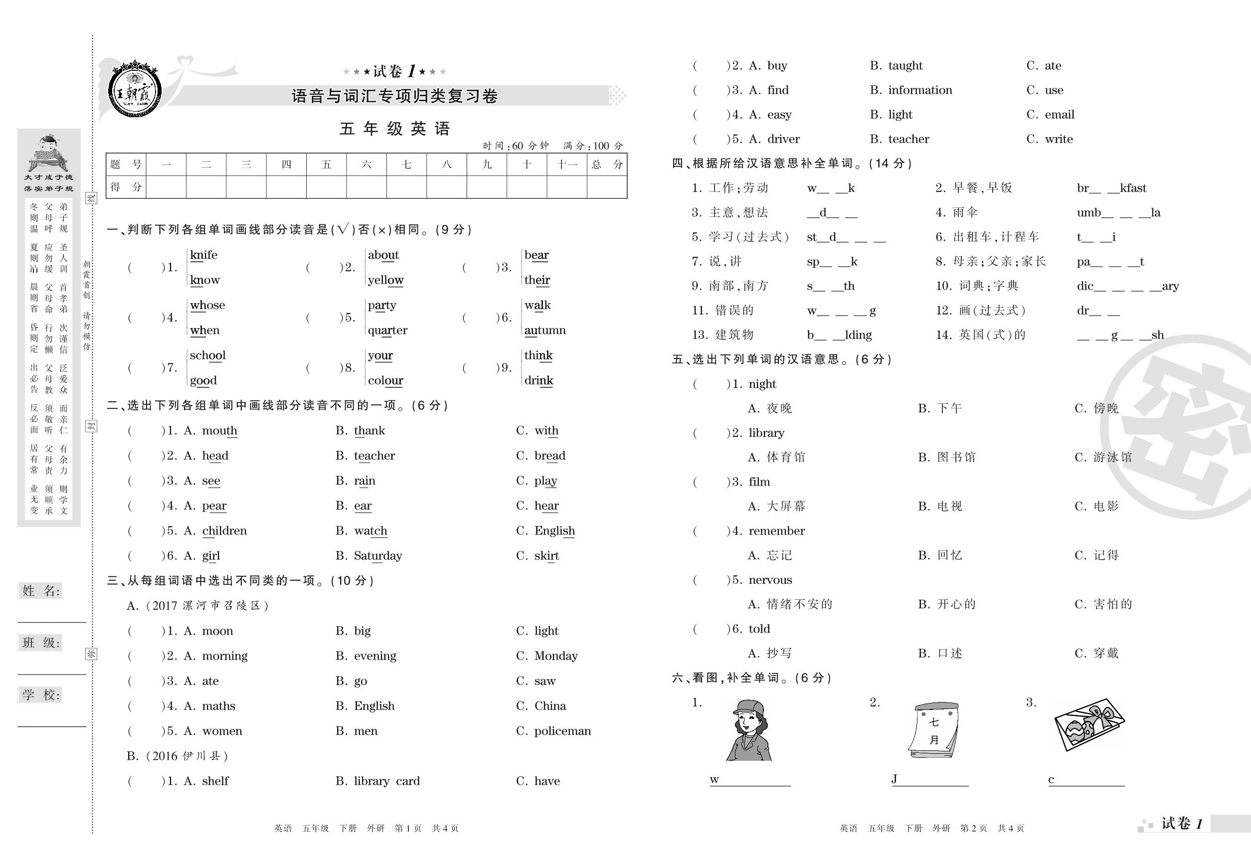 王朝霞期末专项卷——语音与词汇专项归类复习卷五年级下册英语(外研版)【1】