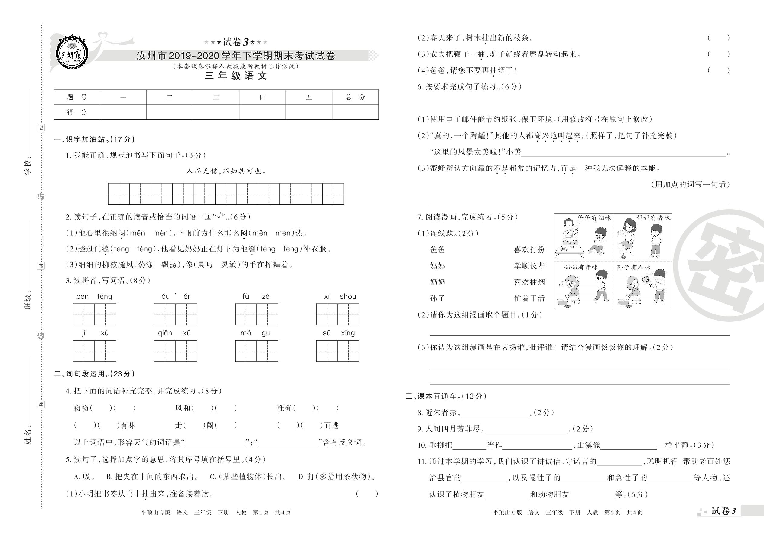2019-2020学年第二学期汝州市三年级语文试卷(人教版)【3】