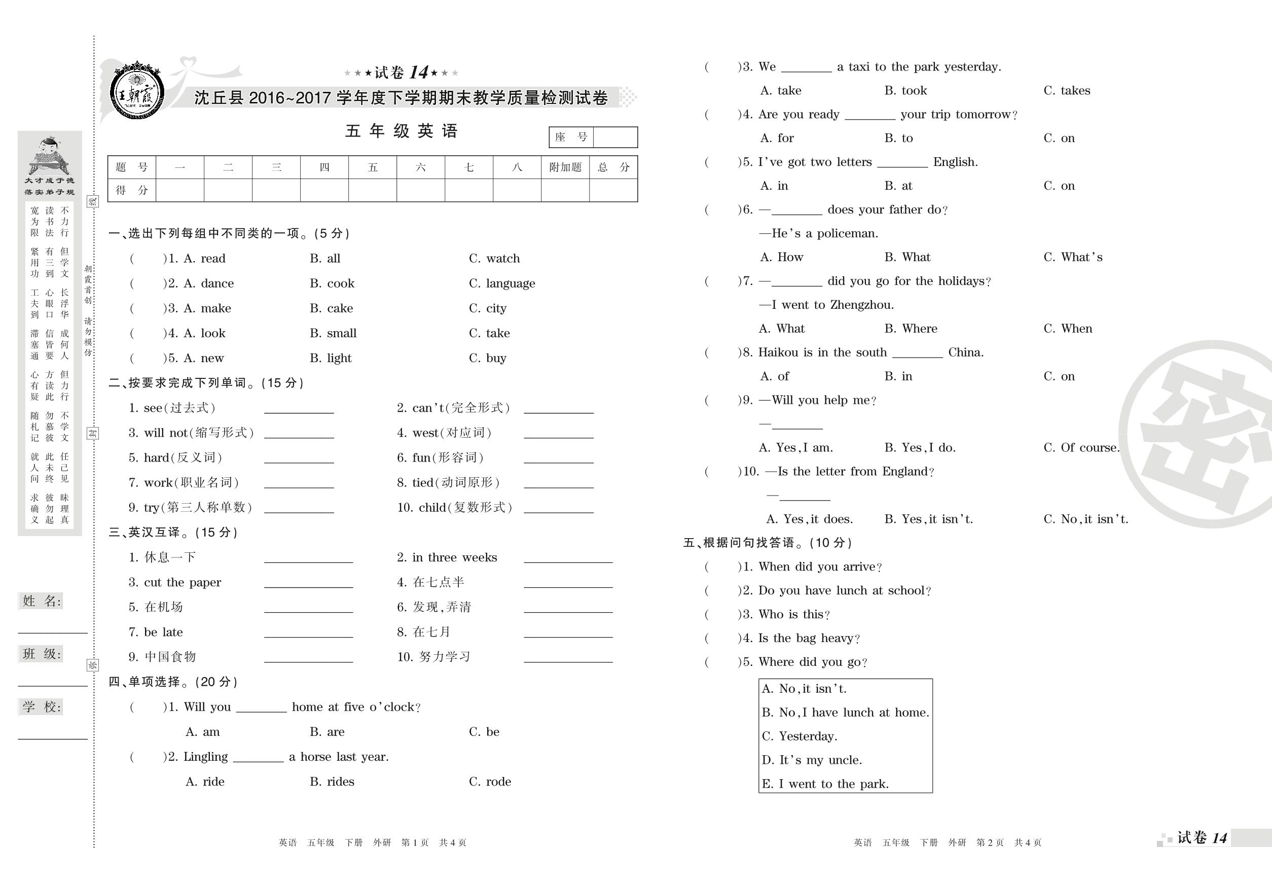 2016-2017学年第二学期周口市沈丘县五年级英语试卷(外研版)【14】