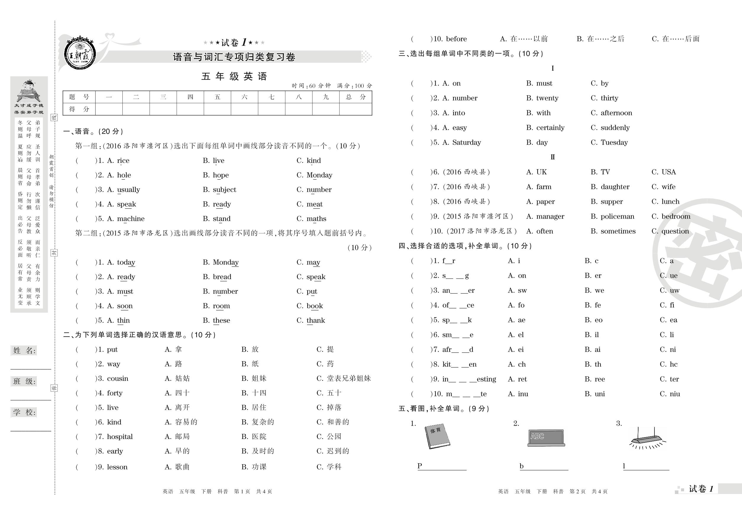 王朝霞期末专项卷——语音与词汇专项归类复习卷五年级下册英语(科普版)【1】