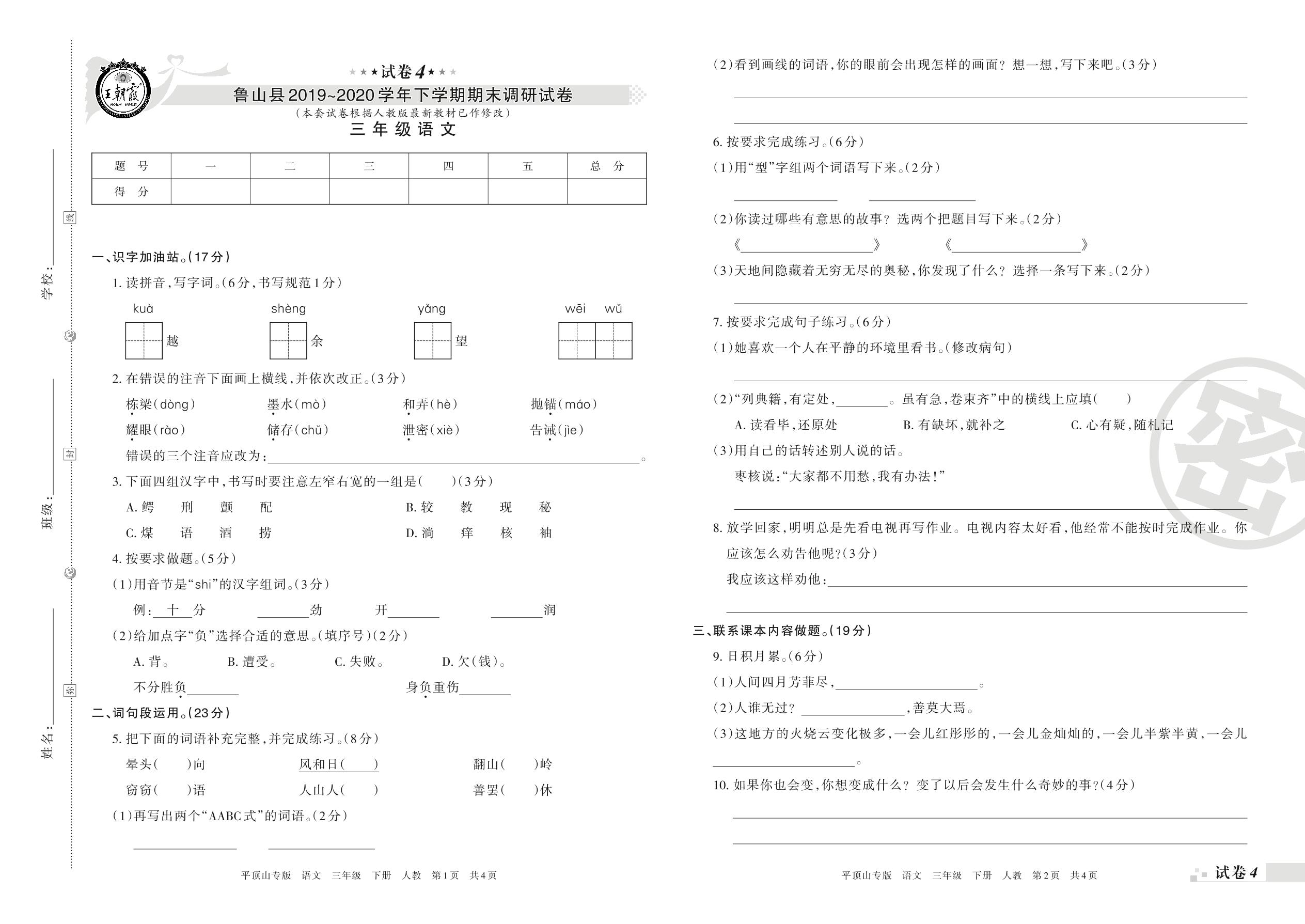 2019-2020学年第二学期平顶山市鲁山县三年级语文试卷(人教版)【4】