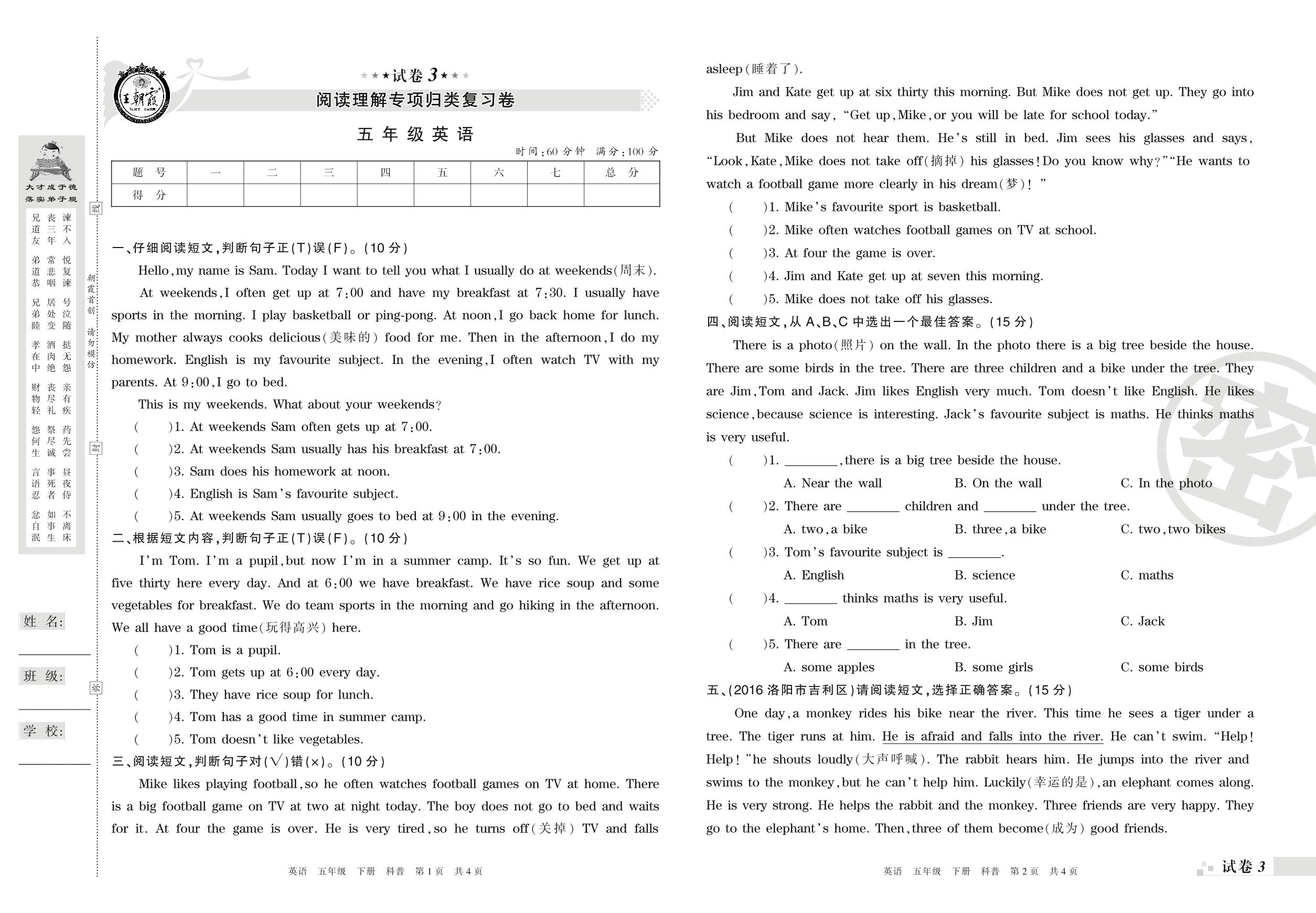 王朝霞期末专项卷——阅读理解专项归类复习卷五年级下册英语(科普版)【3】