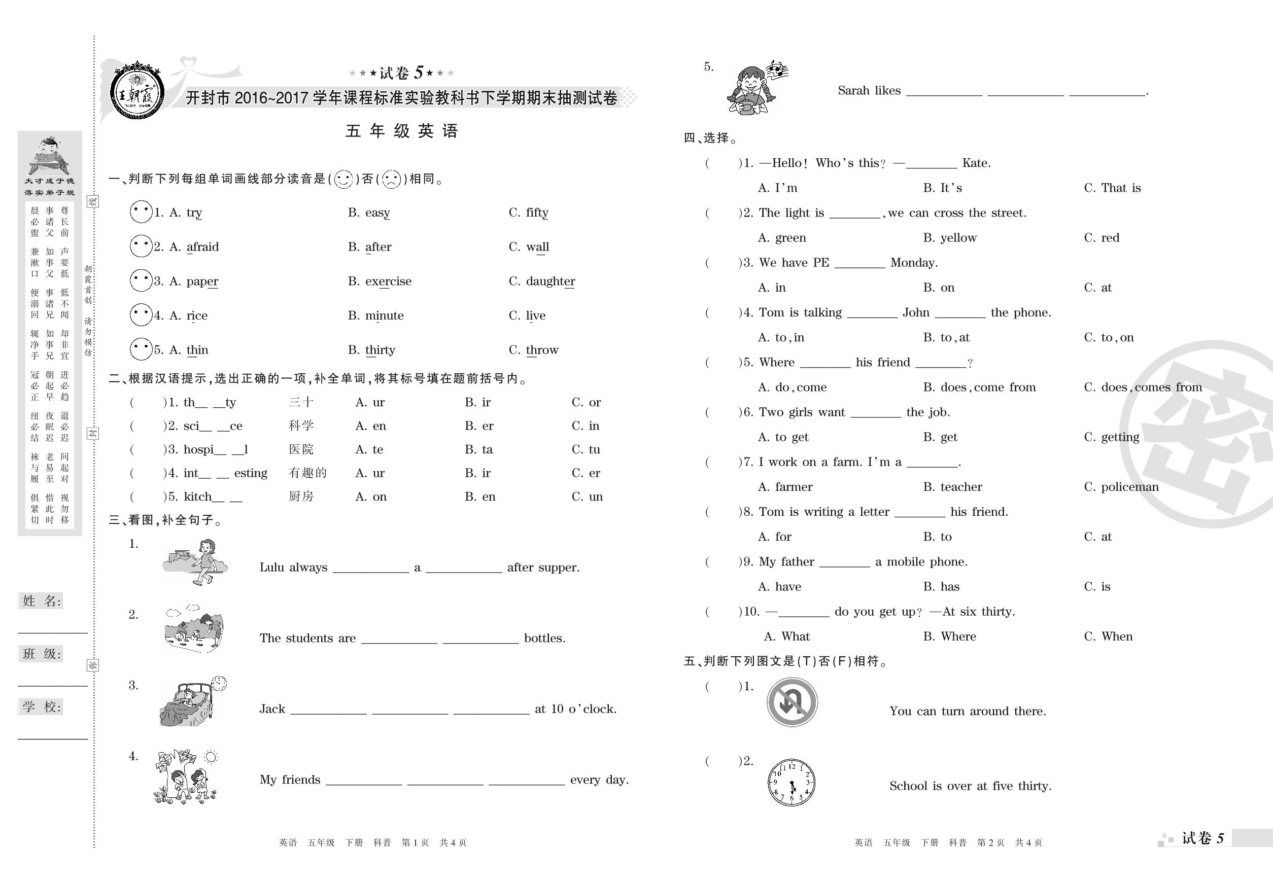 2016-2017学年第二学期开封市五年级英语试卷(科普版)【5】