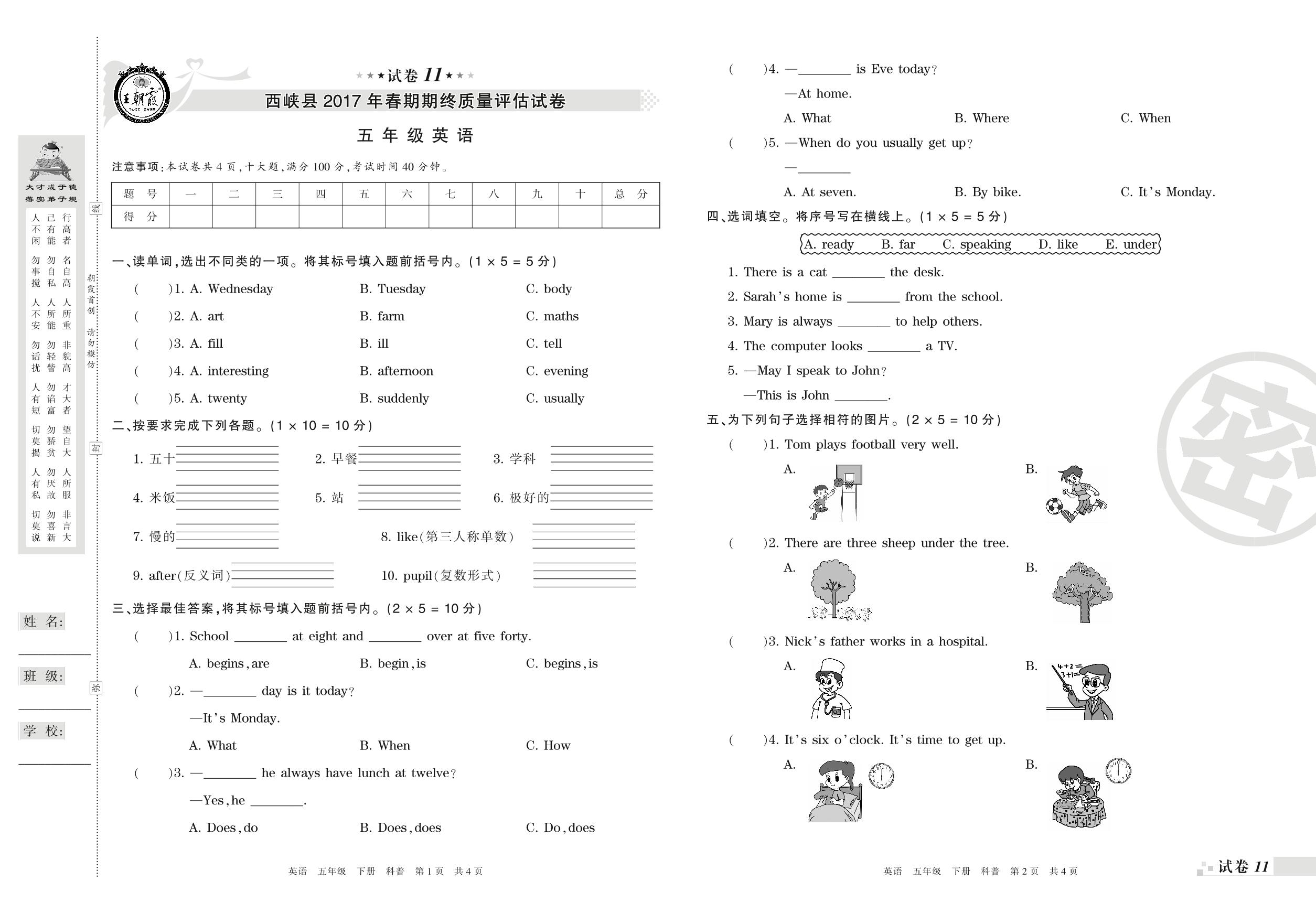 2016-2017学年第二学期南阳市西峡县五年级英语试卷(科普版)【11】