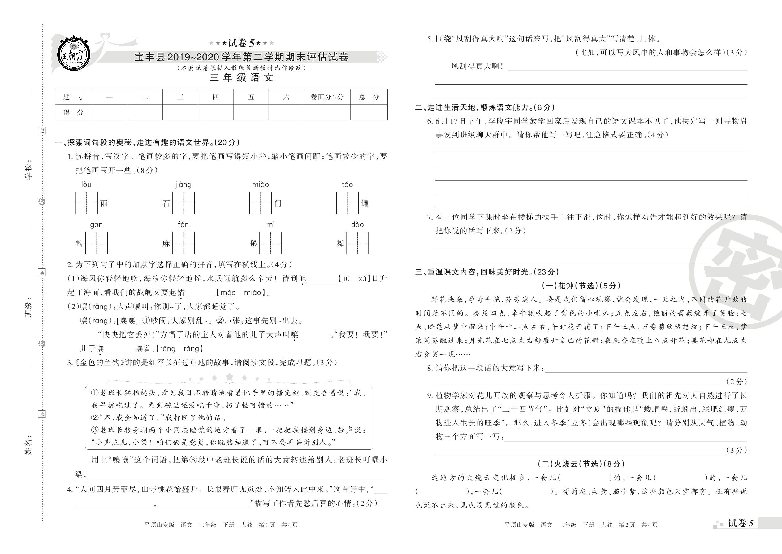 2019-2020学年第二学期平顶山市宝丰县三年级语文试卷(人教版)【5】