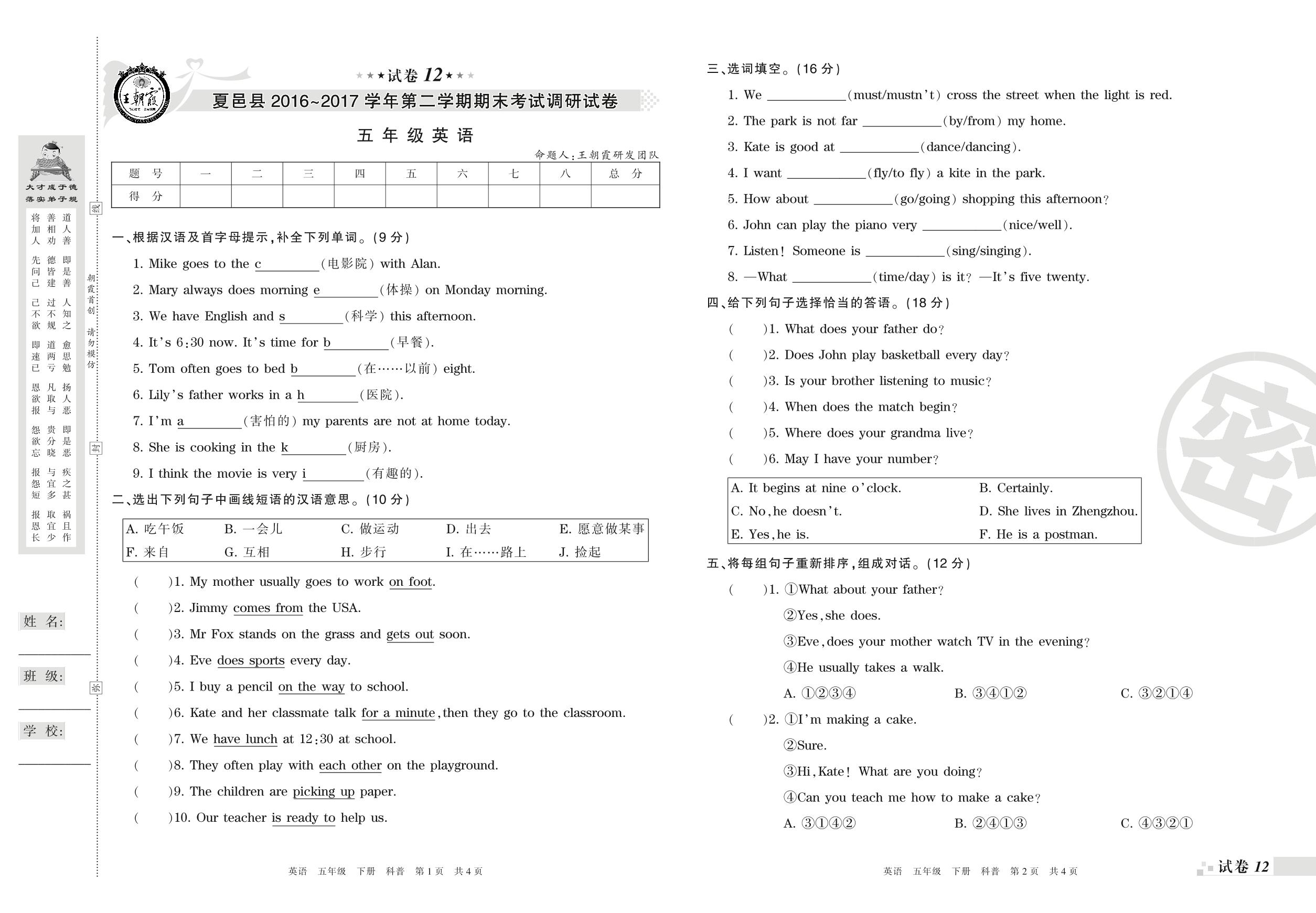 2016-2017学年第二学期商丘市夏邑县五年级英语试卷(科普版)【12】
