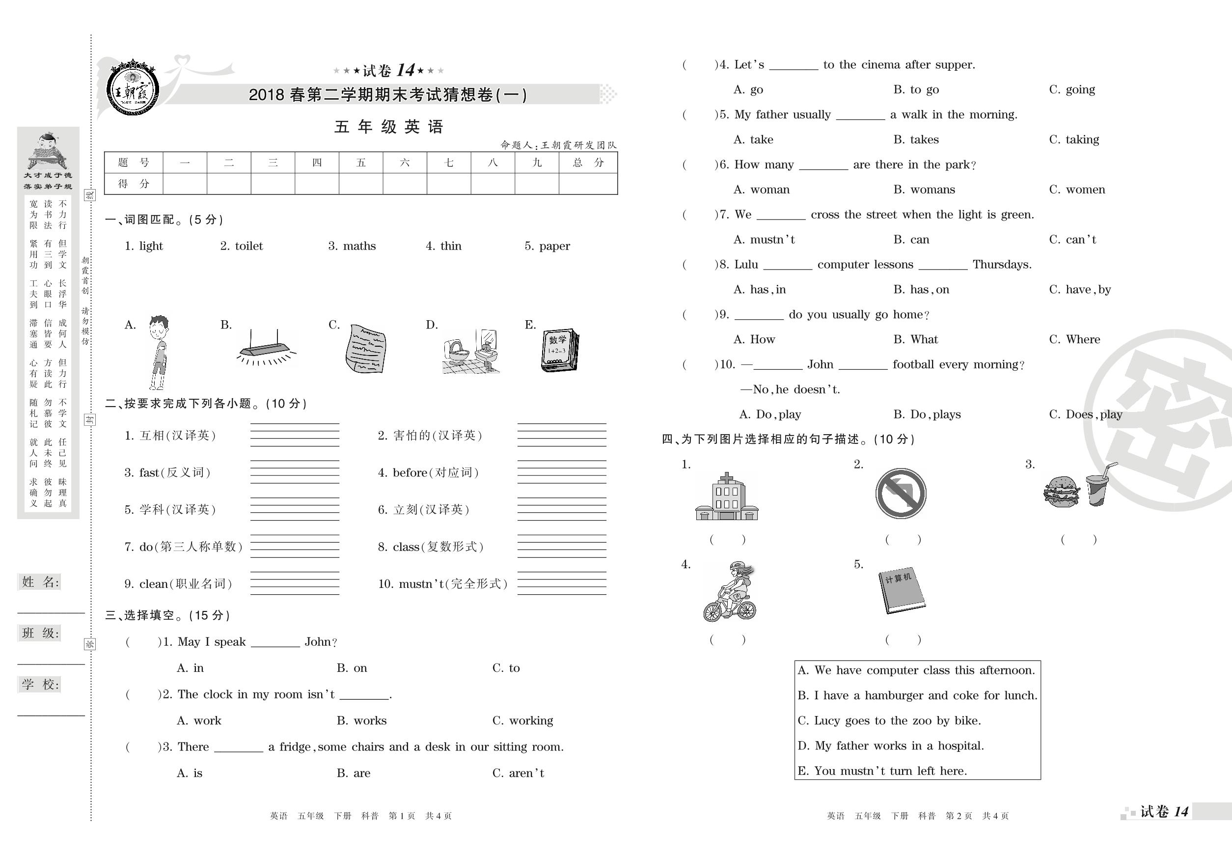 2017-2018学年第二学期期末考试猜想卷(一)五年级英语(科普版)【14】