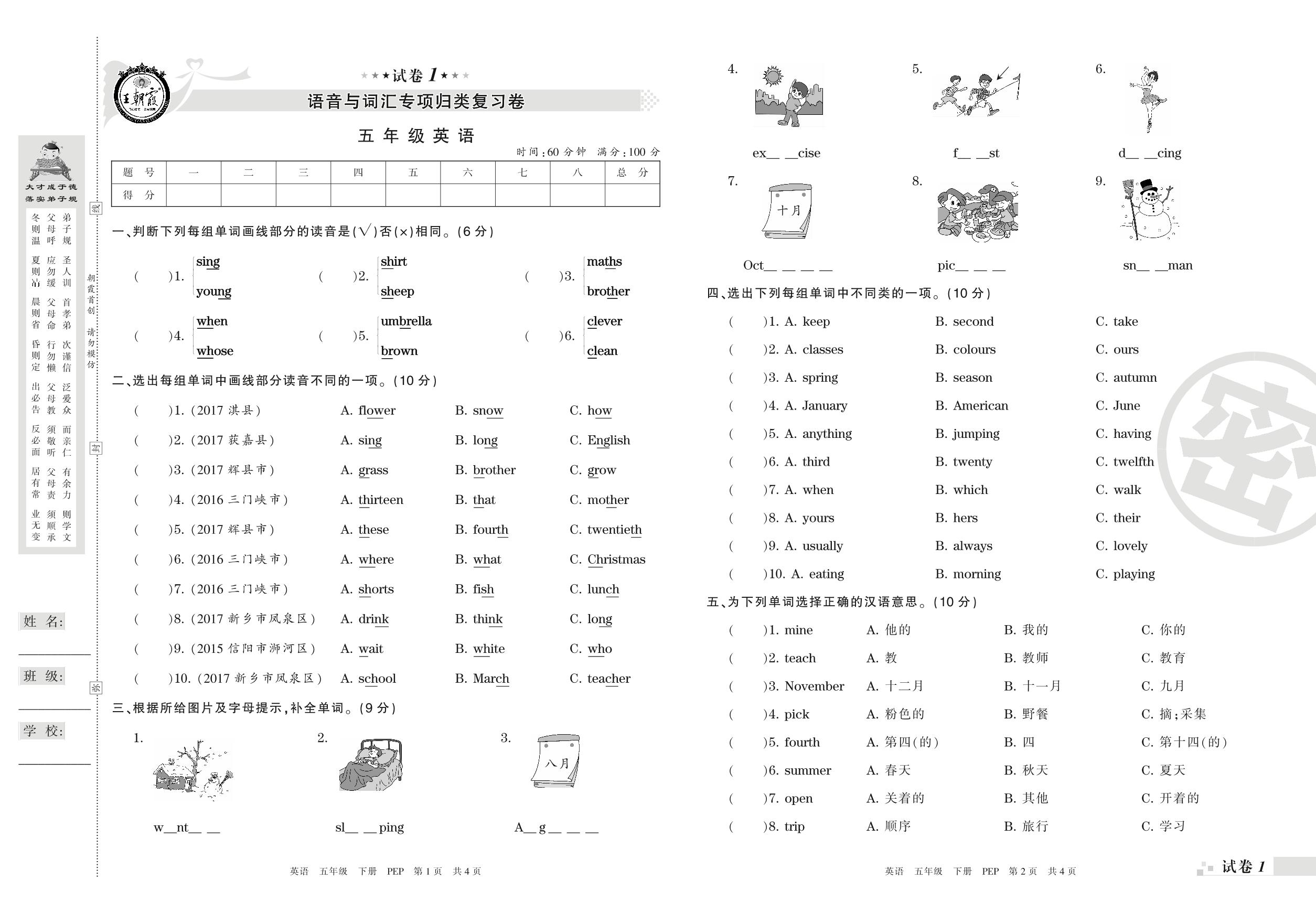 王朝霞期末专项卷——语音与词汇专项归类复习卷五年级下册英语(PEP版)【1】
