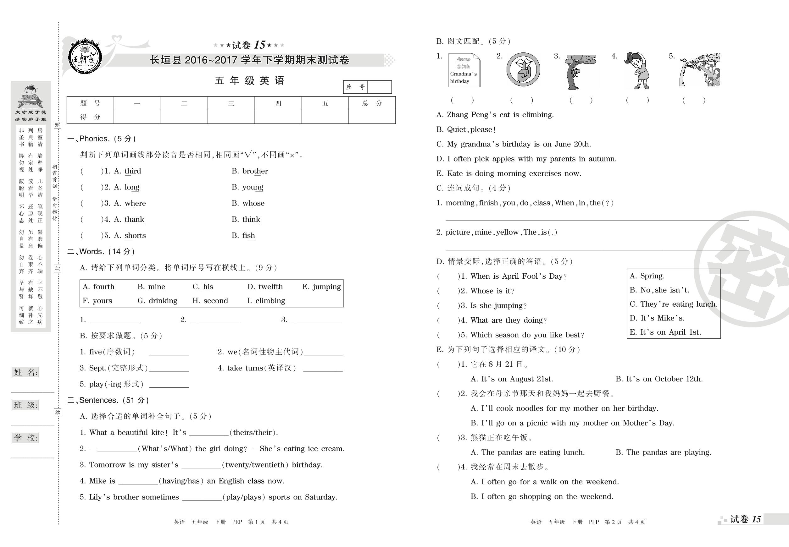 五年级英语人教PEP版(三起始)下册期末卷