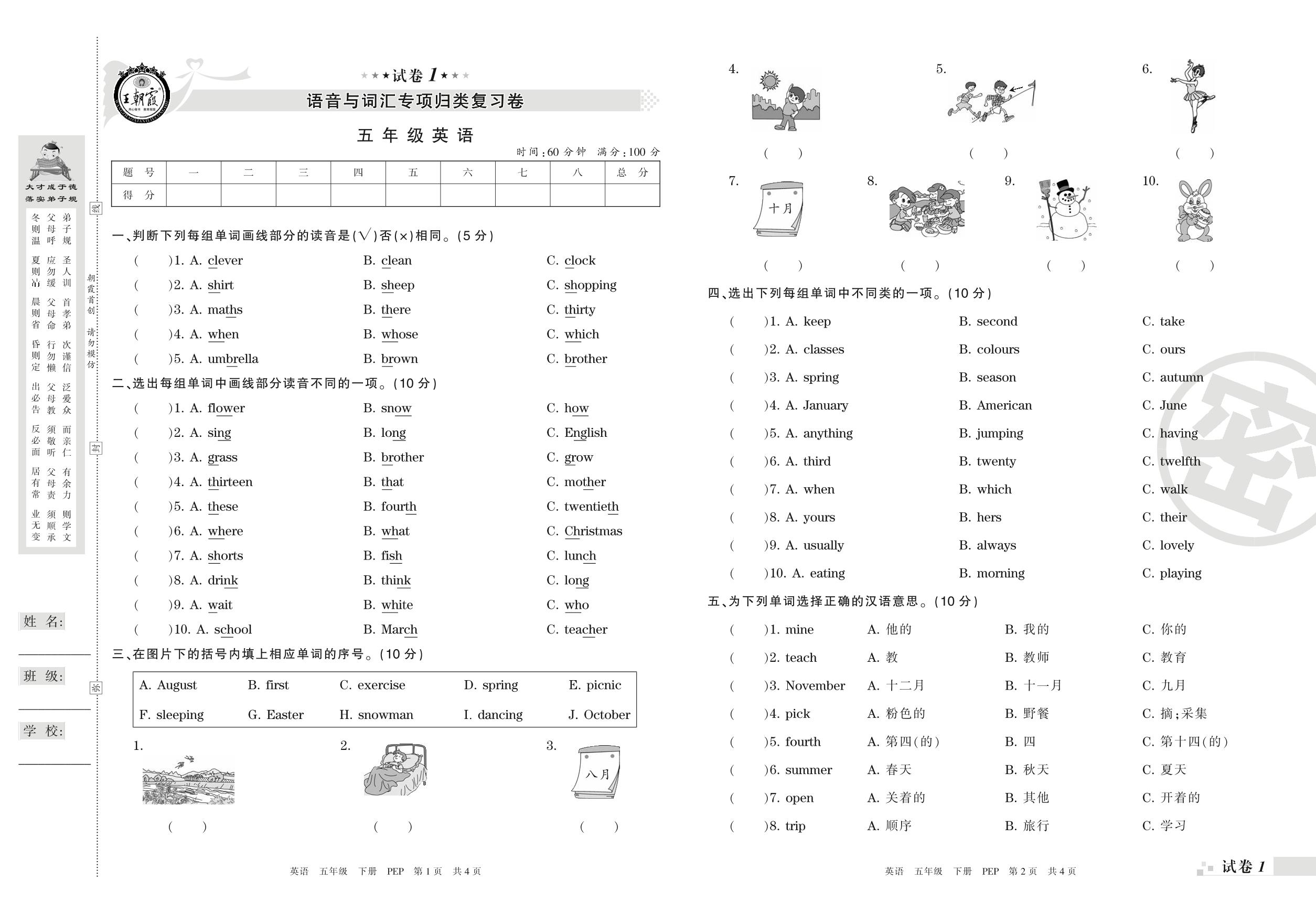 王朝霞期末专项卷——语音与词汇专项归类复习卷五年级下册英语(PEP版)_R220123154025706【1】