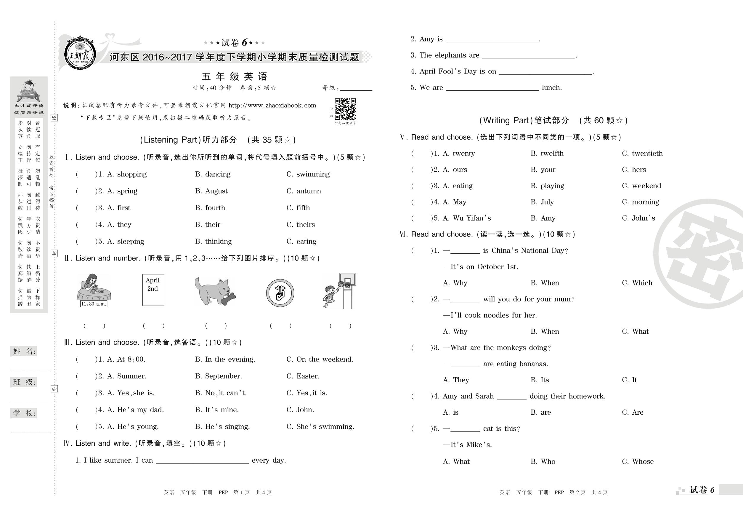 2016-2017学年第二学期临沂市河东区五年级英语试卷(PEP版)【6】