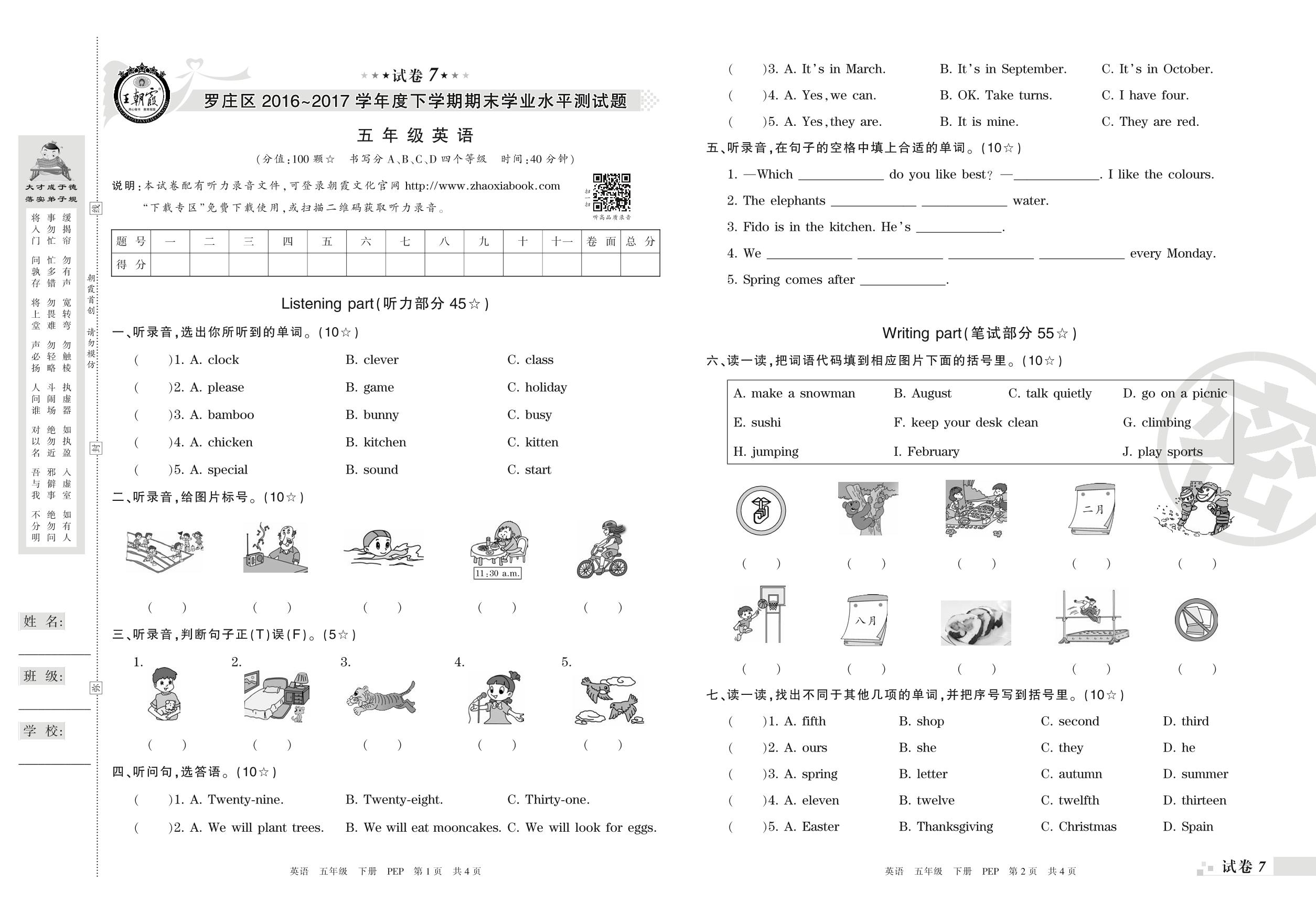 2016-2017学年第二学期临沂市罗庄区五年级英语试卷(PEP版)【7】