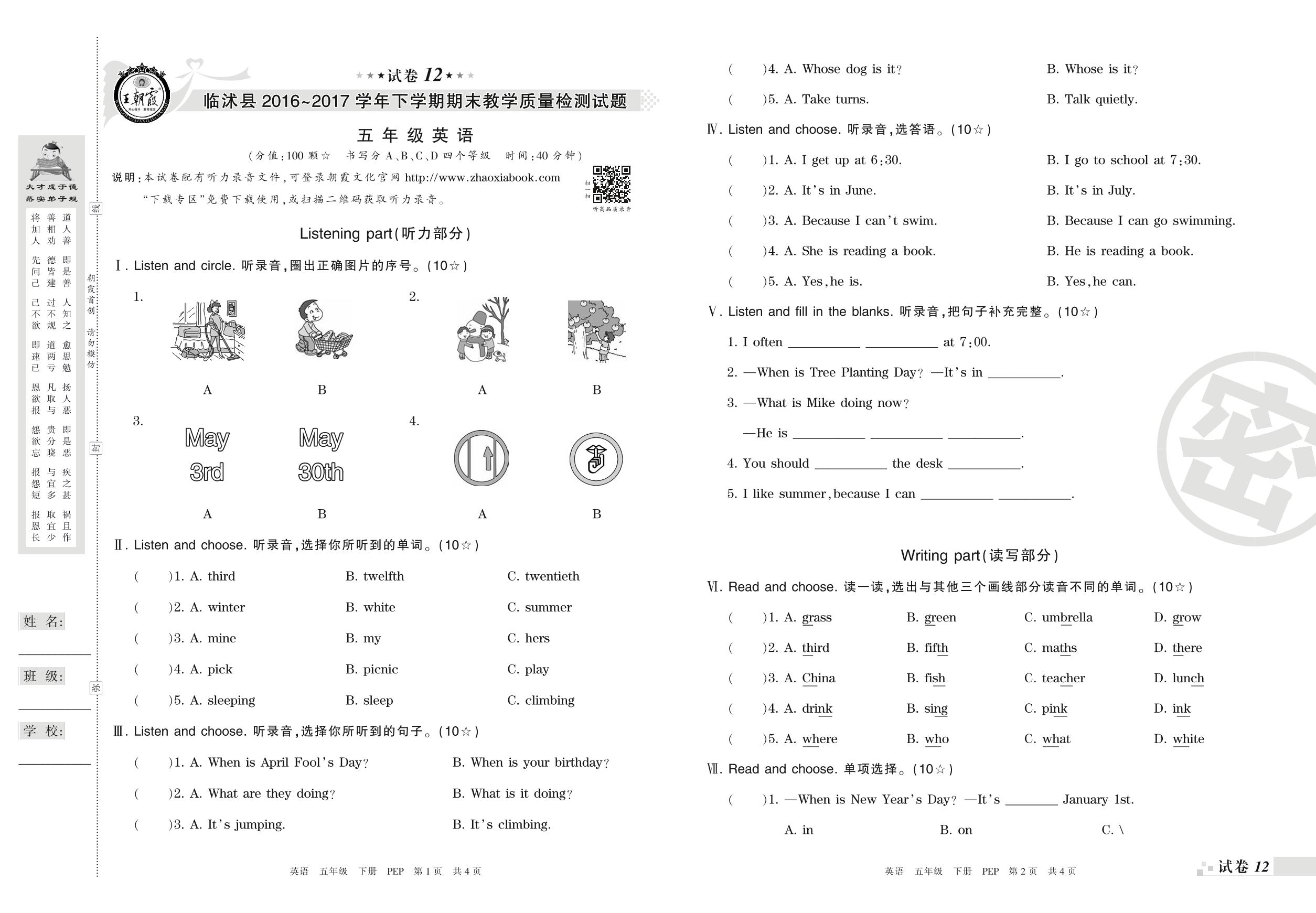 2016-2017学年第二学期临沂市临沭县五年级英语试卷(PEP版)【12】