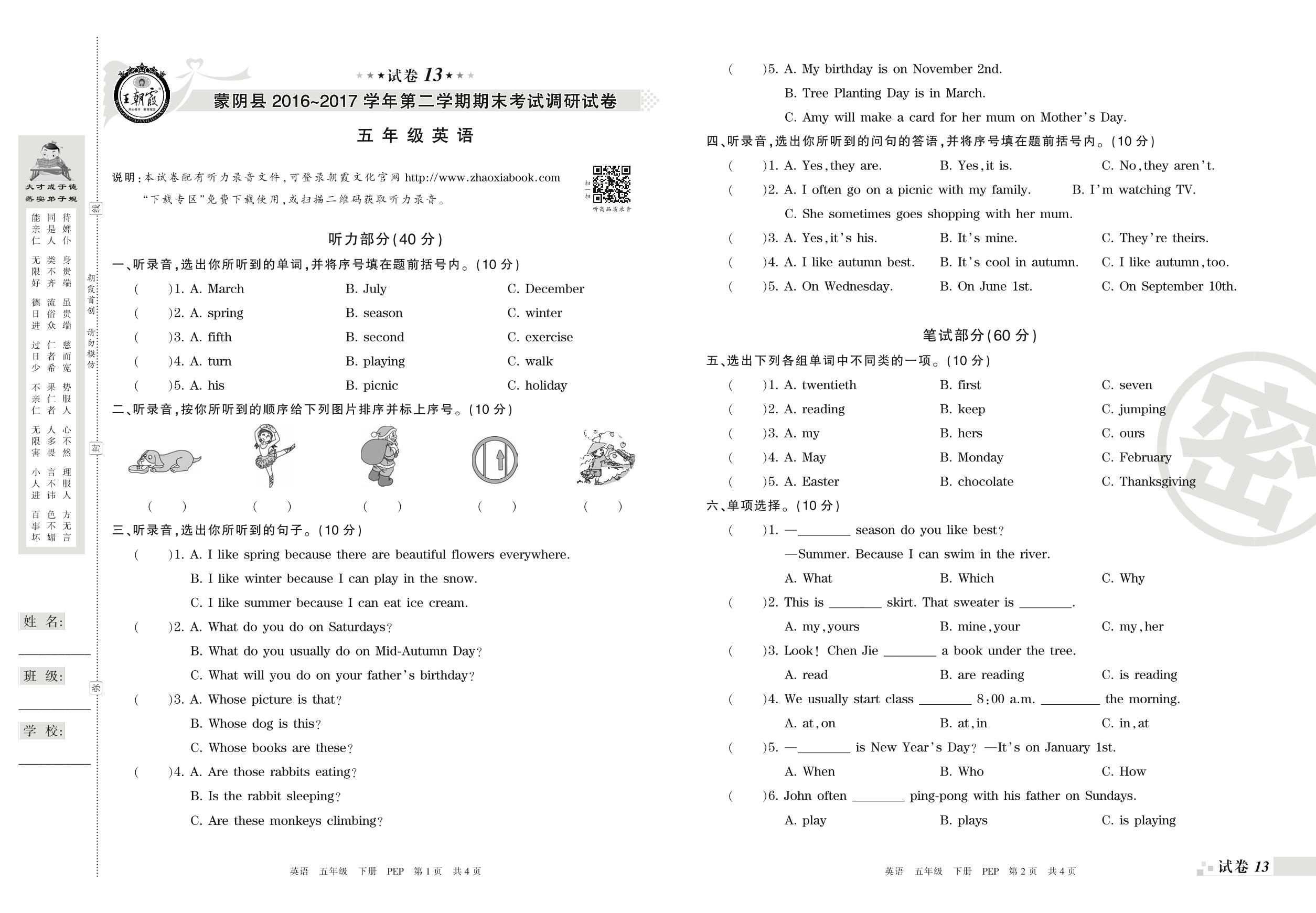2016-2017学年第二学期临沂市蒙阴县五年级英语试卷(PEP版)【13】