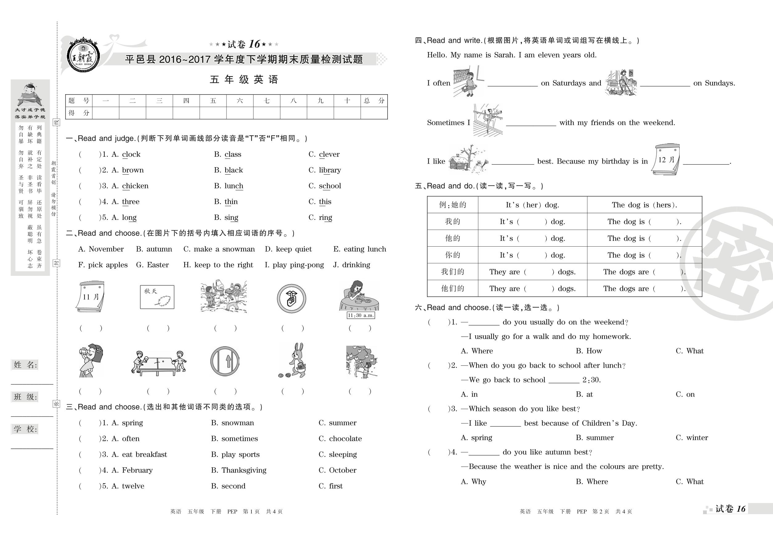 2016-2017学年第二学期临沂市平邑县五年级英语试卷(PEP版)【16】