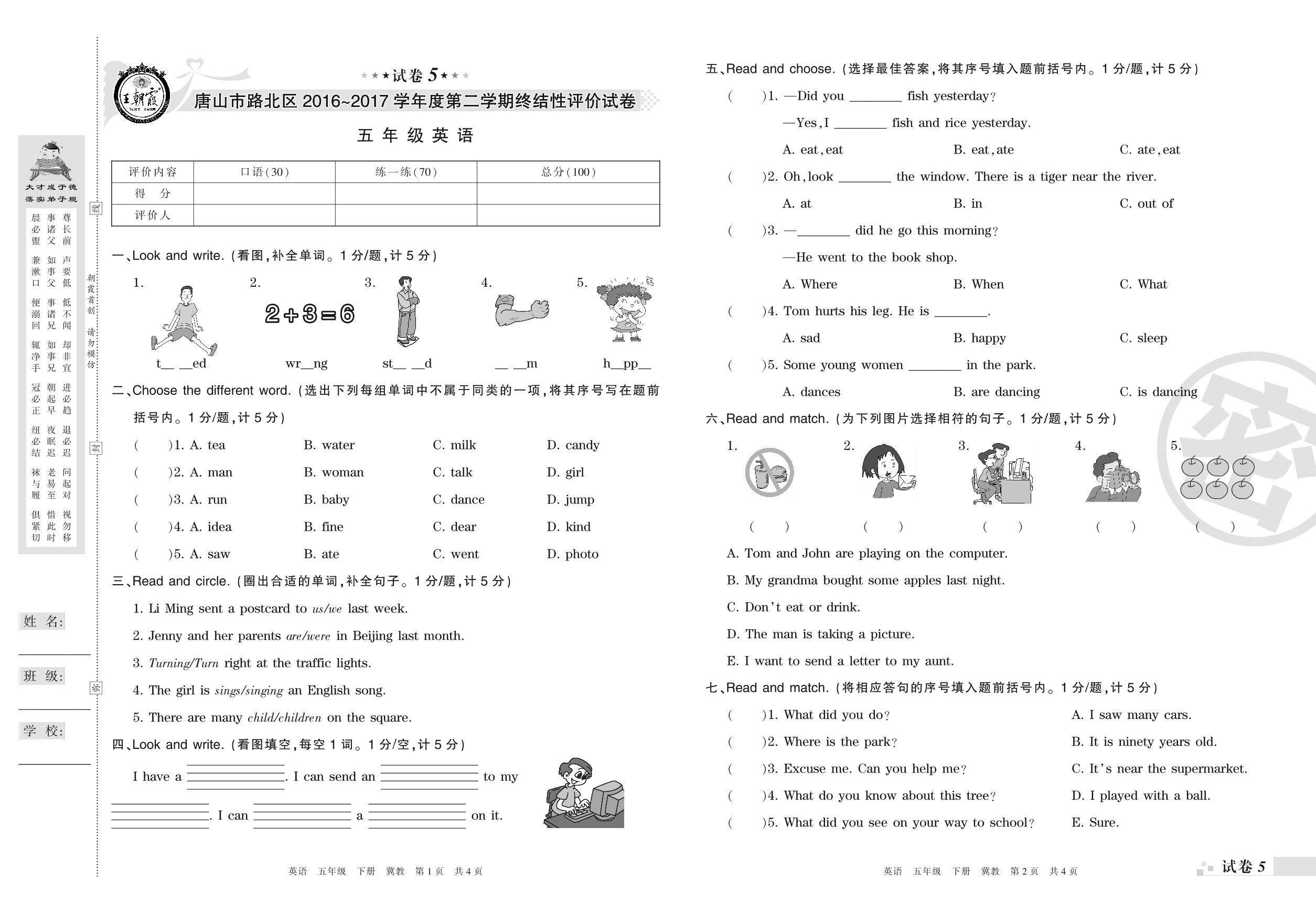 2016-2017学年第二学期唐山市路北区五年级英语试卷(冀教版)【5】