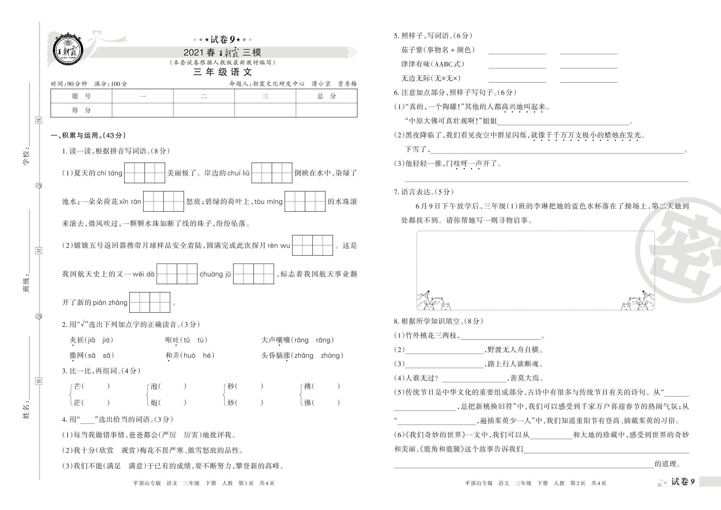 王朝霞期末模拟卷三年级下册语文(人教版)_R21080183515【9】