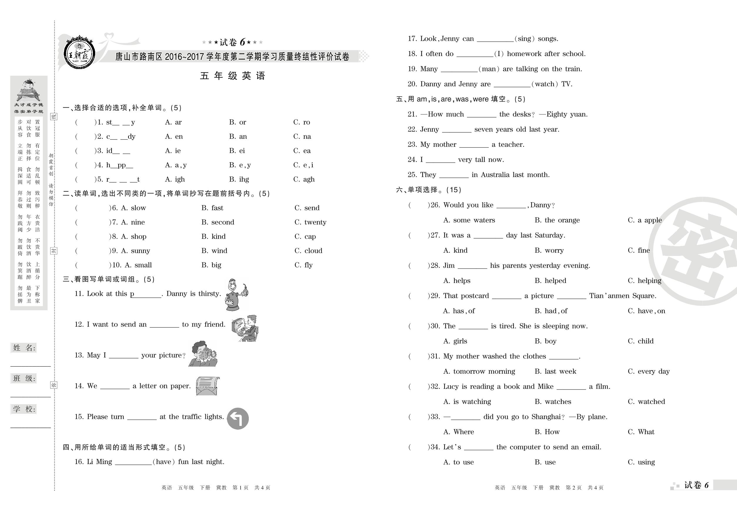 2016-2017学年第二学期唐山市路南区五年级英语试卷(冀教版)【6】