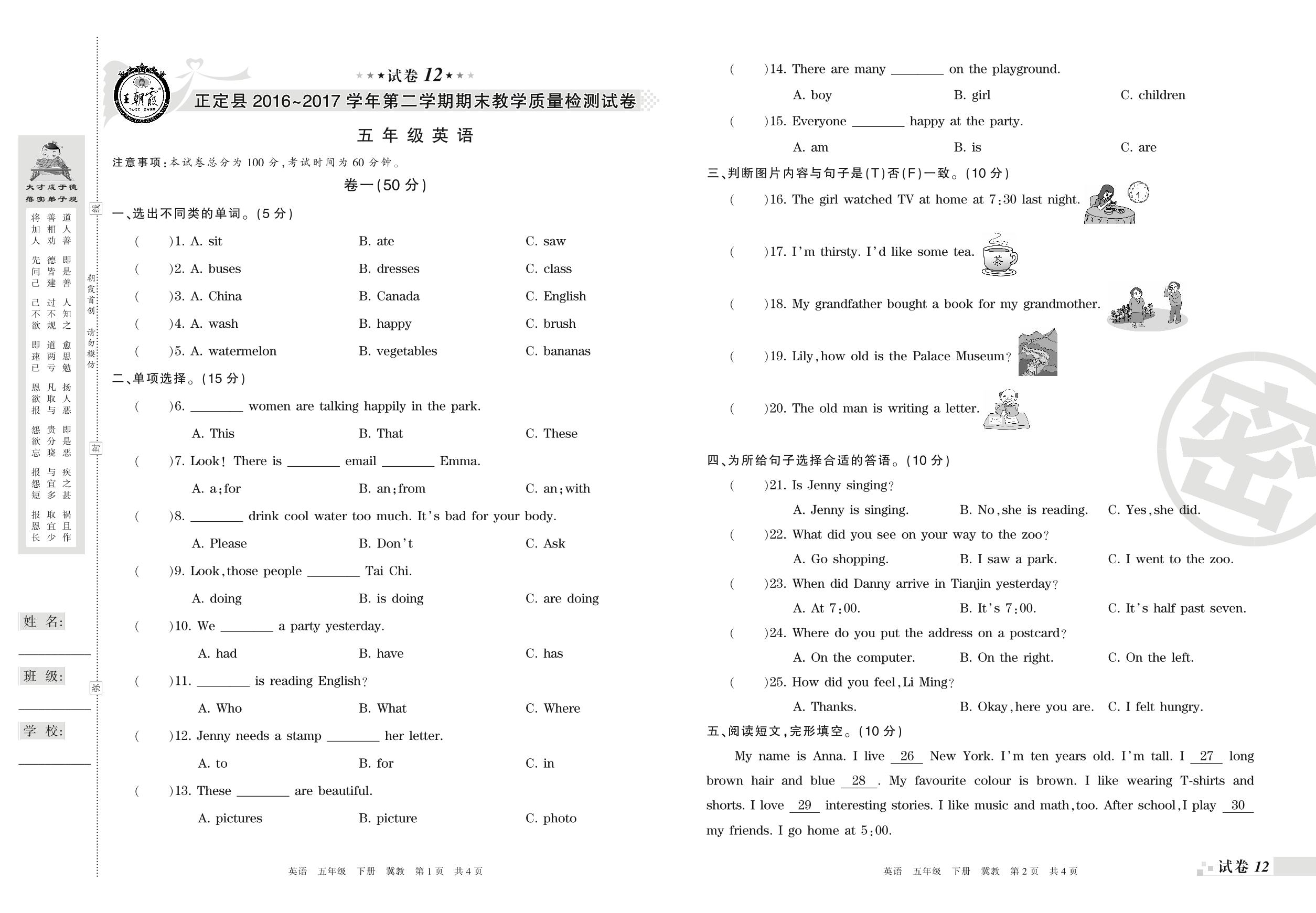 2016-2017学年第二学期石家庄市正定县五年级英语试卷(冀教版)【12】