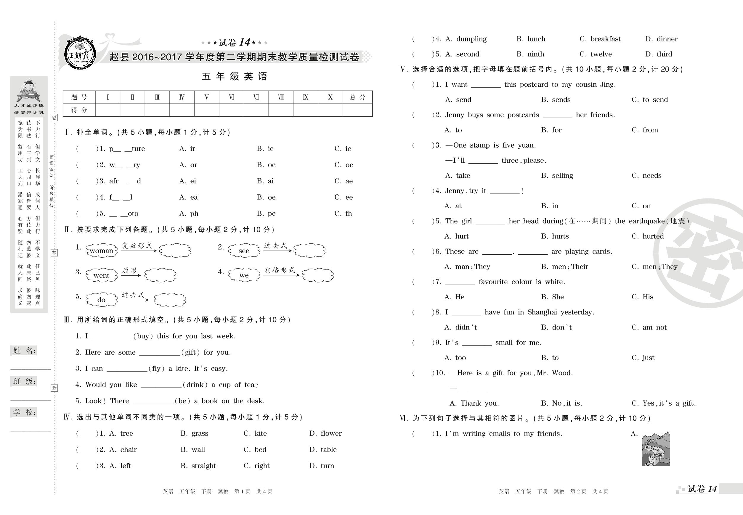2016-2017学年第二学期石家庄市赵县五年级英语试卷(冀教版)【14】