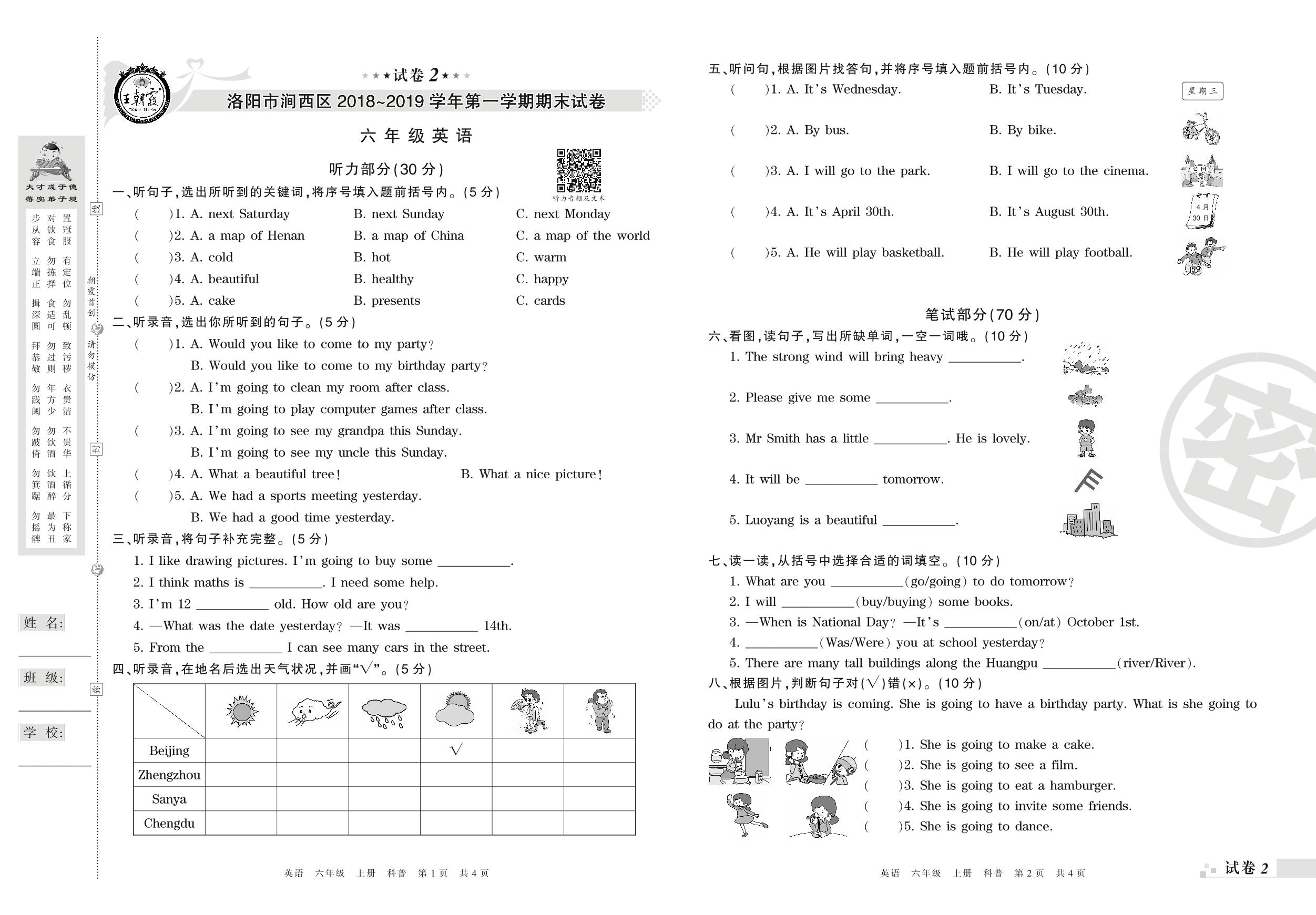 2018-2019学年第一学期洛阳市涧西区六年级英语试卷(科普版)_R211113135657160【2】