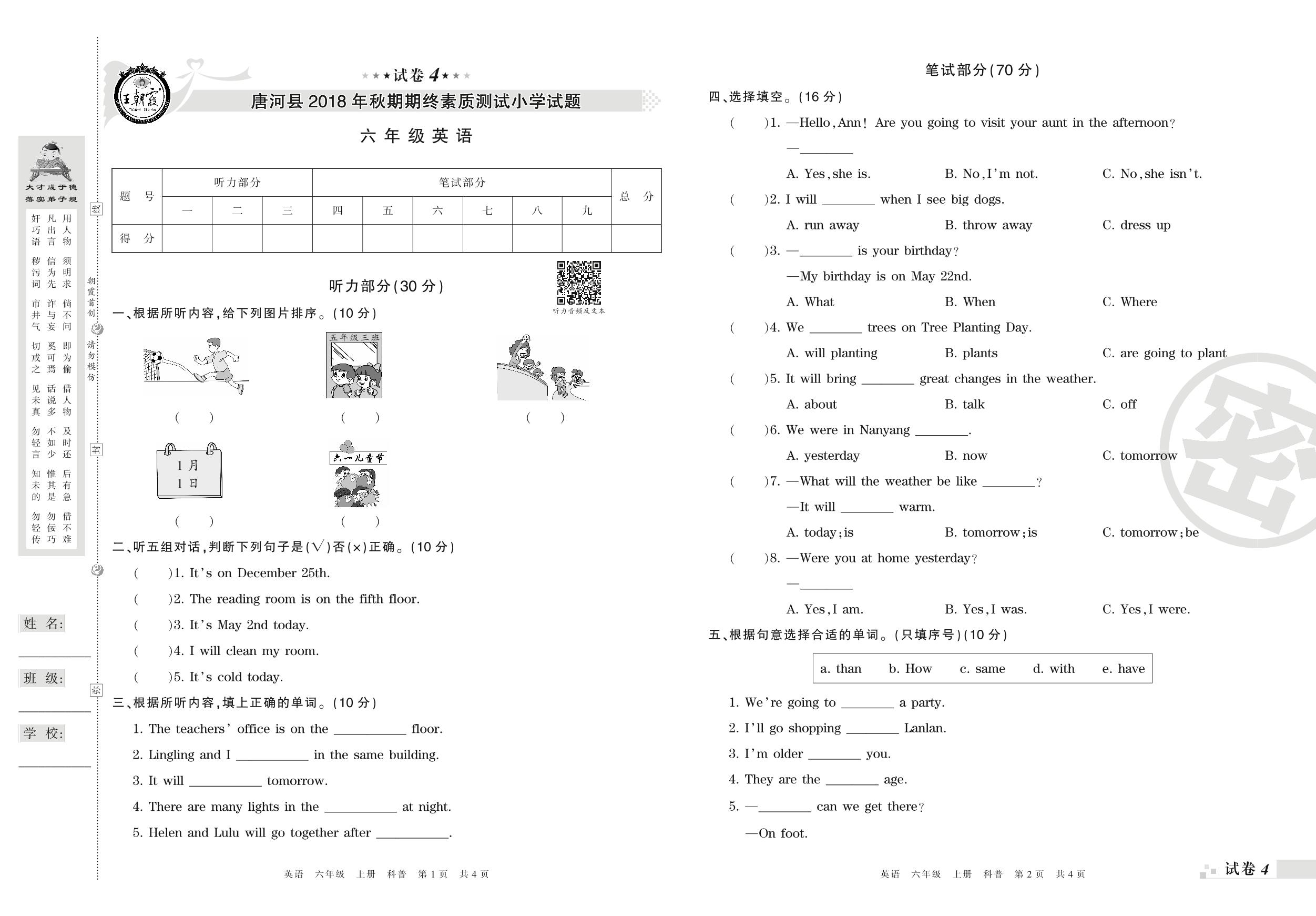 2018-2019学年第一学期南阳市唐河县六年级英语试卷(科普版)【4】