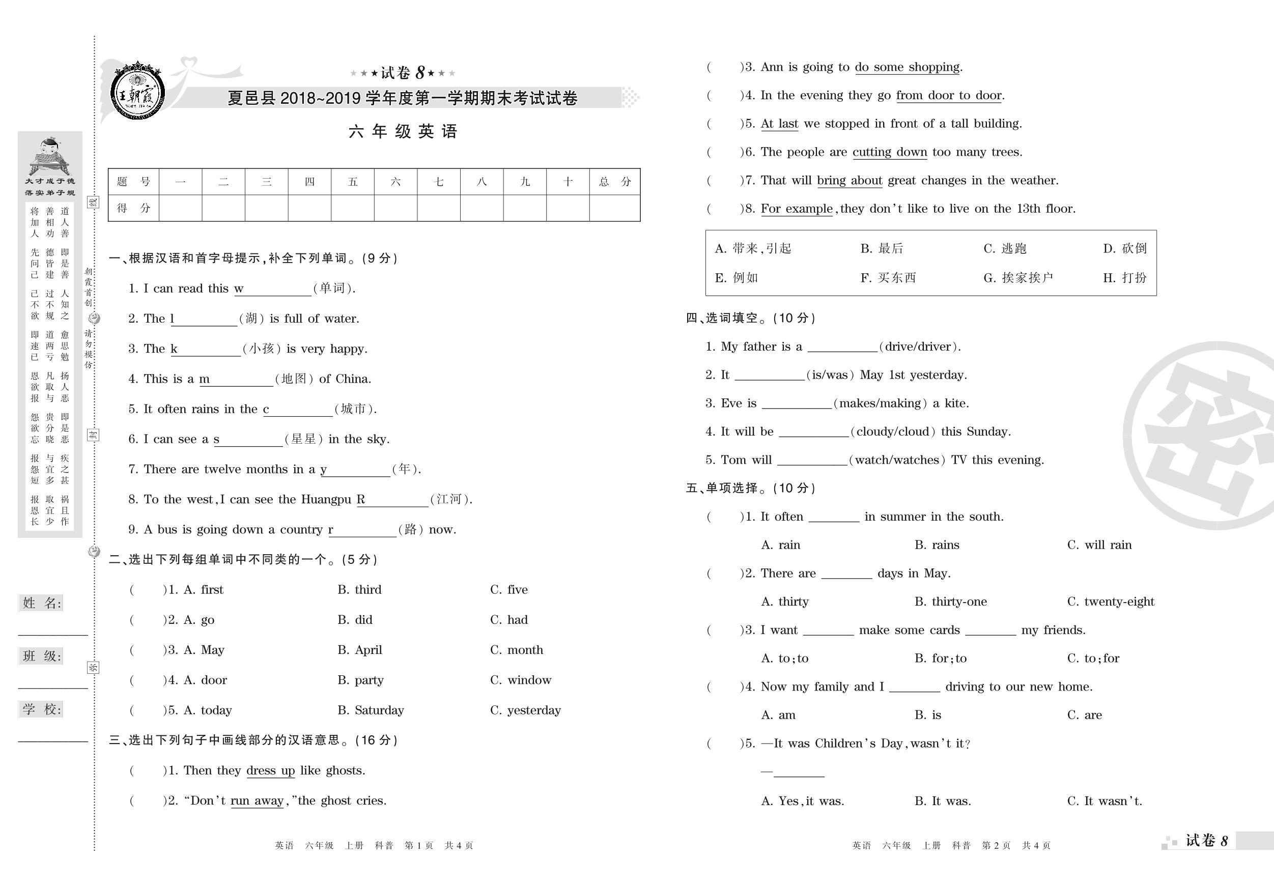 2018-2019学年第一学期商丘市夏邑县六年级英语试卷(科普版)【8】