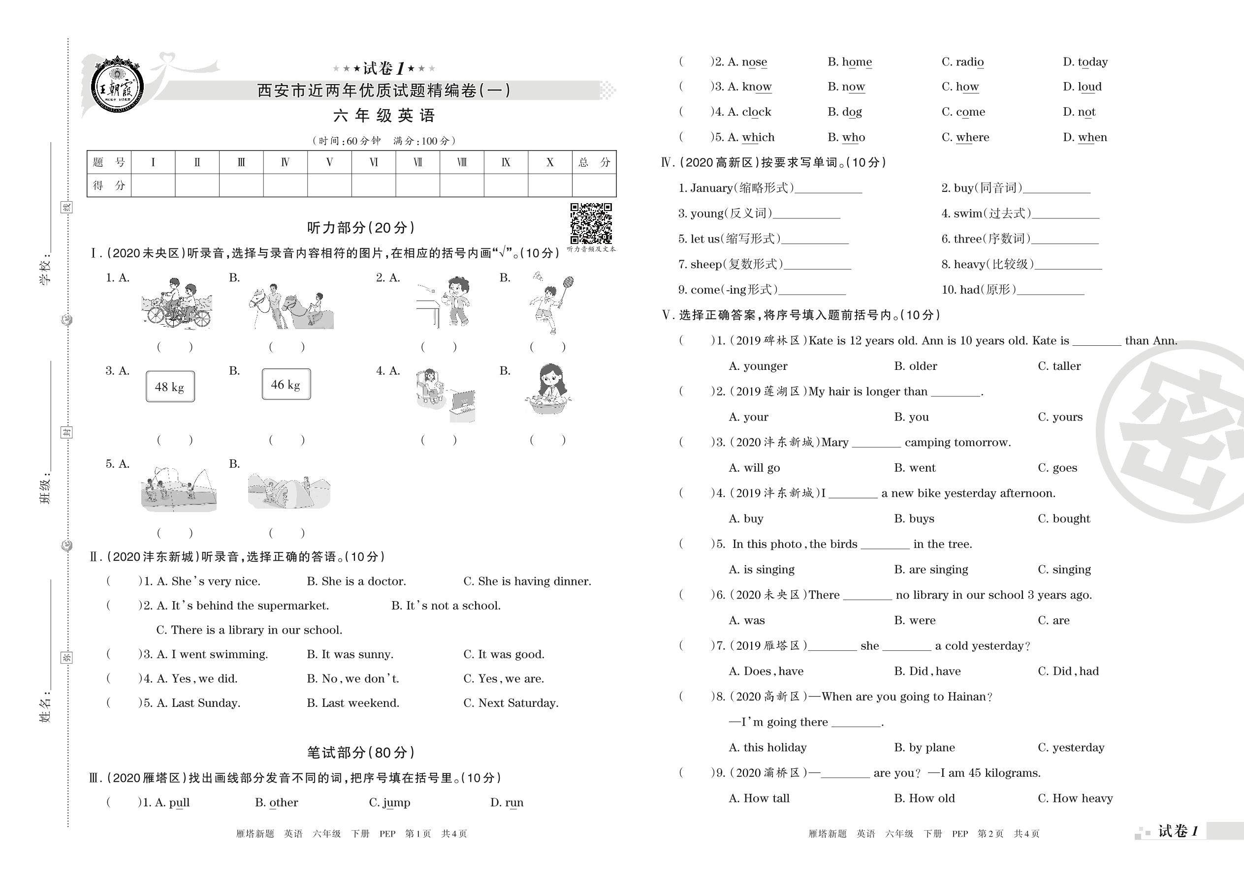 优质试题精编卷(一)六年级下册英语(PEP版)【1】