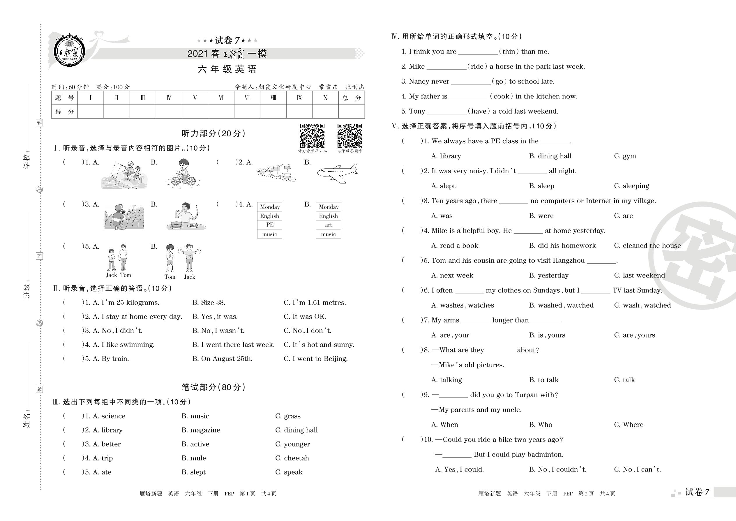 王朝霞期末模拟卷六年级下册英语(PEP版)_R210807154431【7】