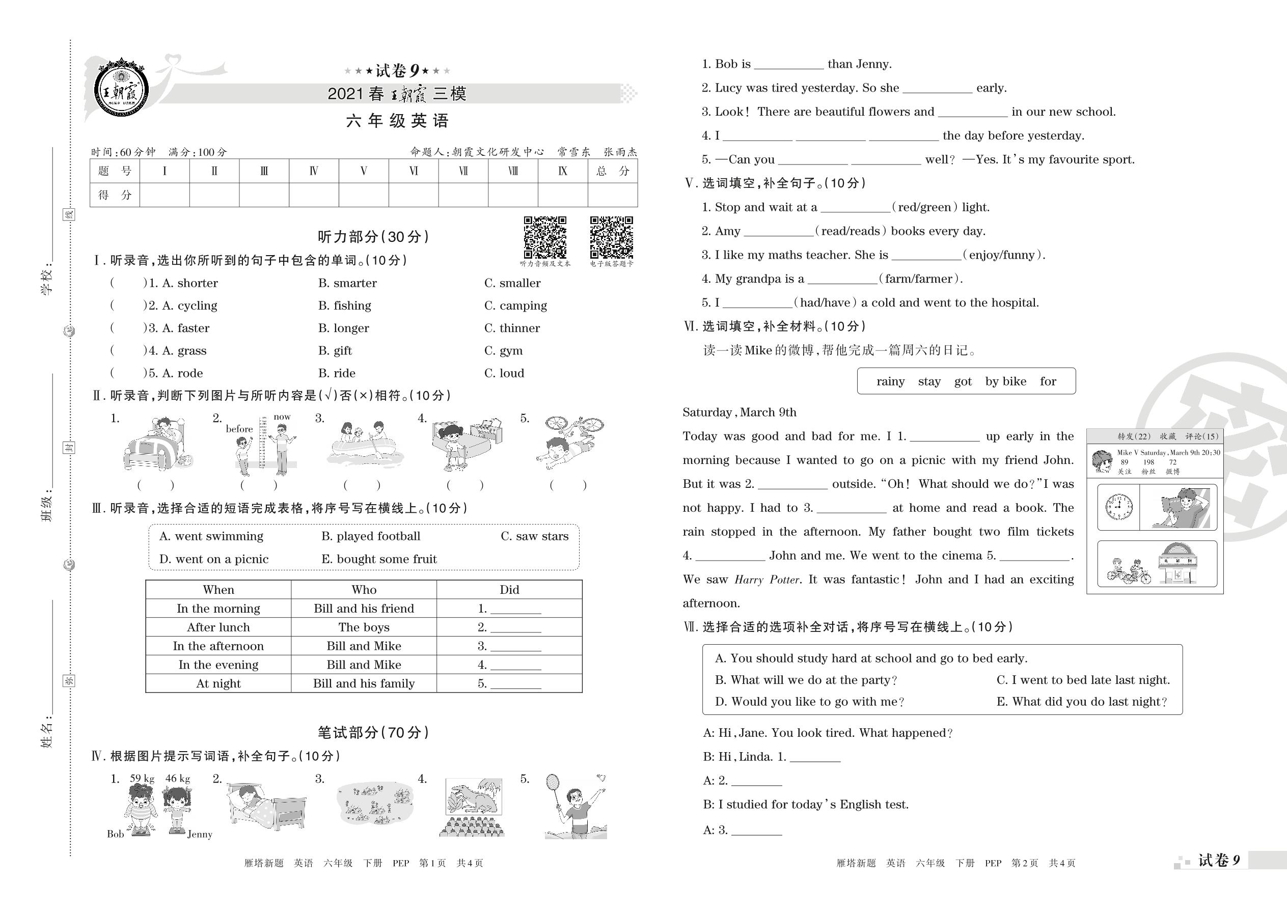 王朝霞期末模拟卷六年级下册英语(PEP版)_R210807154436【9】