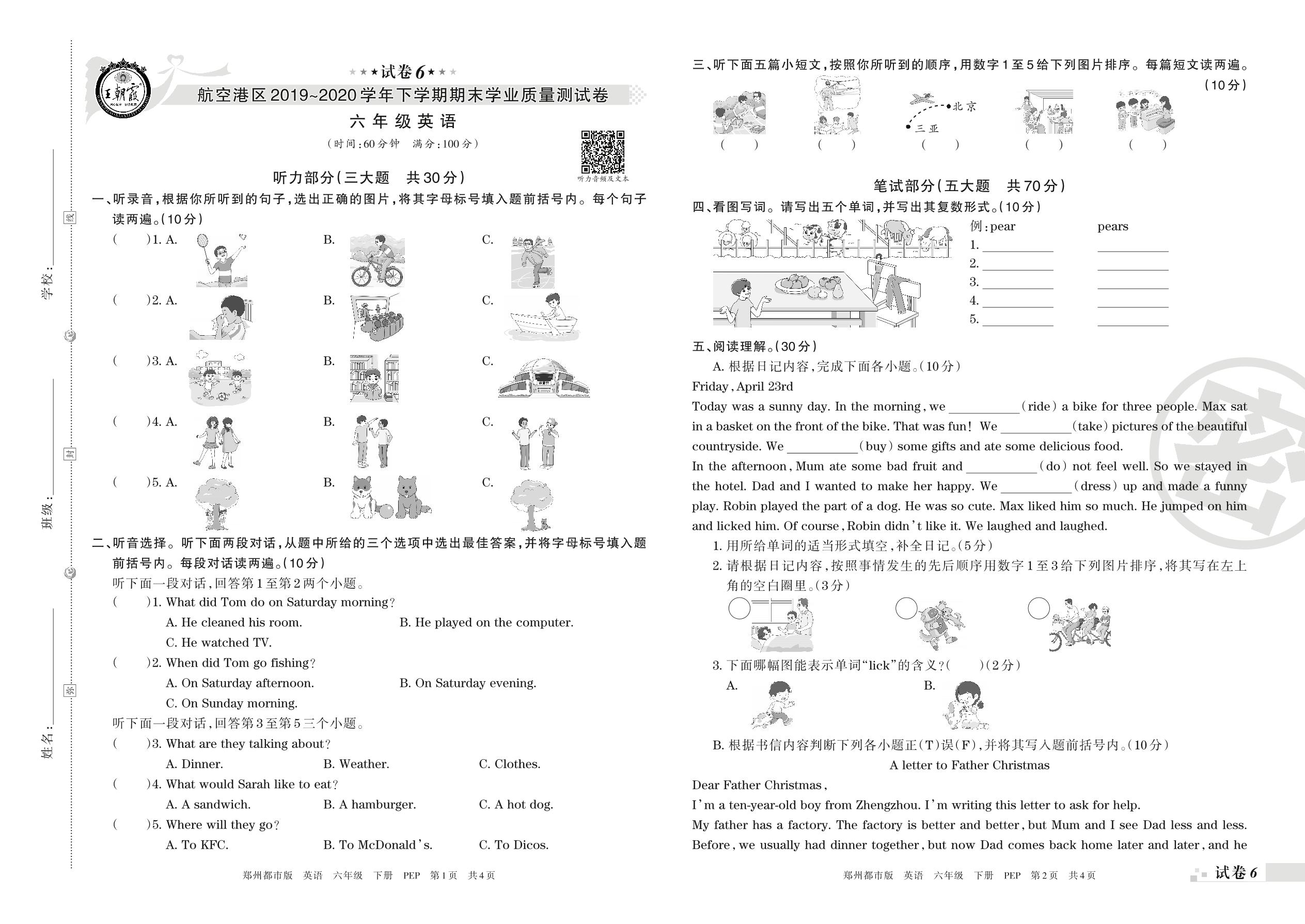 2019-2020学年第二学期郑州市航空港区六年级英语试卷(PEP版)【6】
