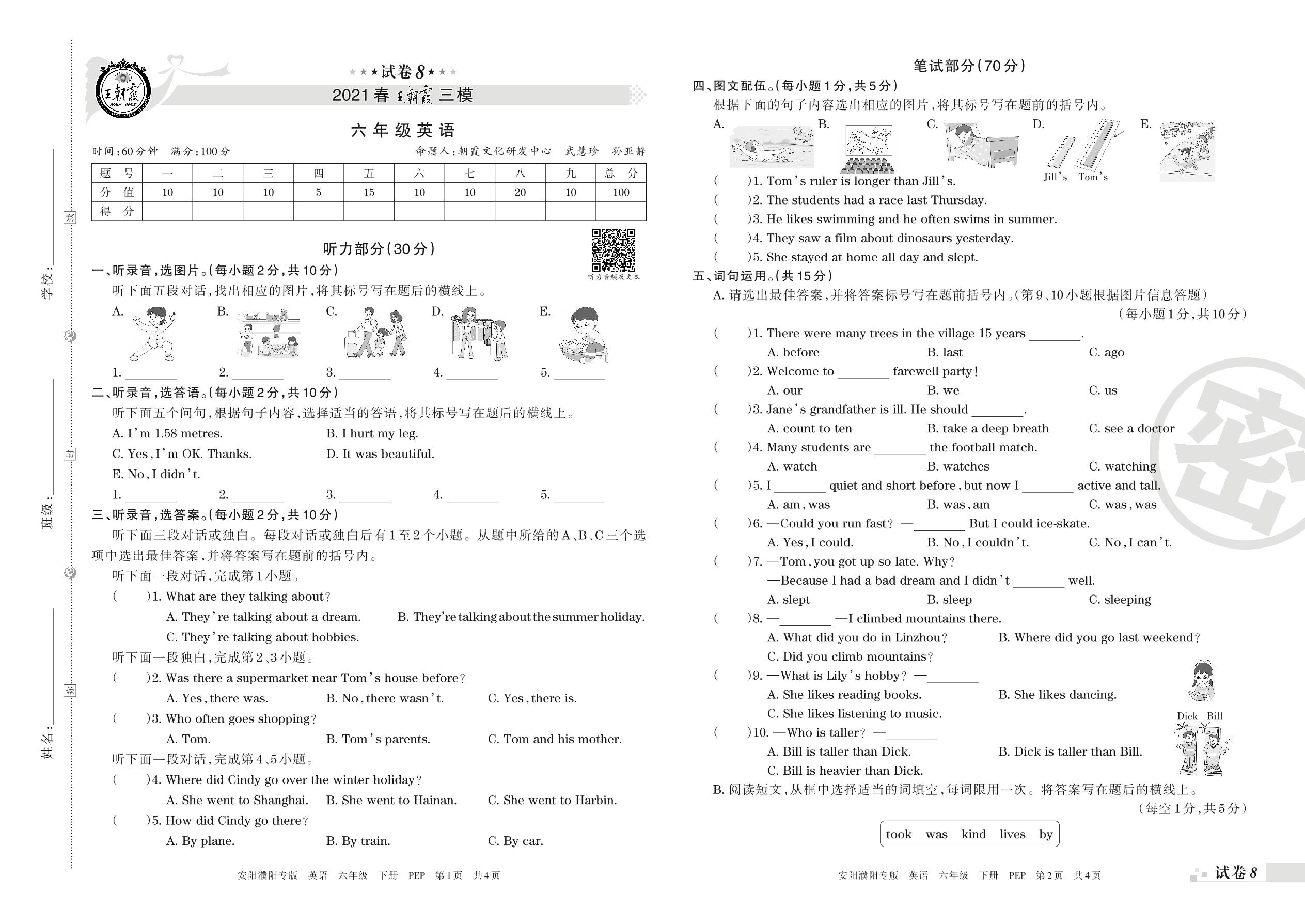 王朝霞期末模拟卷六年级下册英语(PEP版)_R210807154703【8】