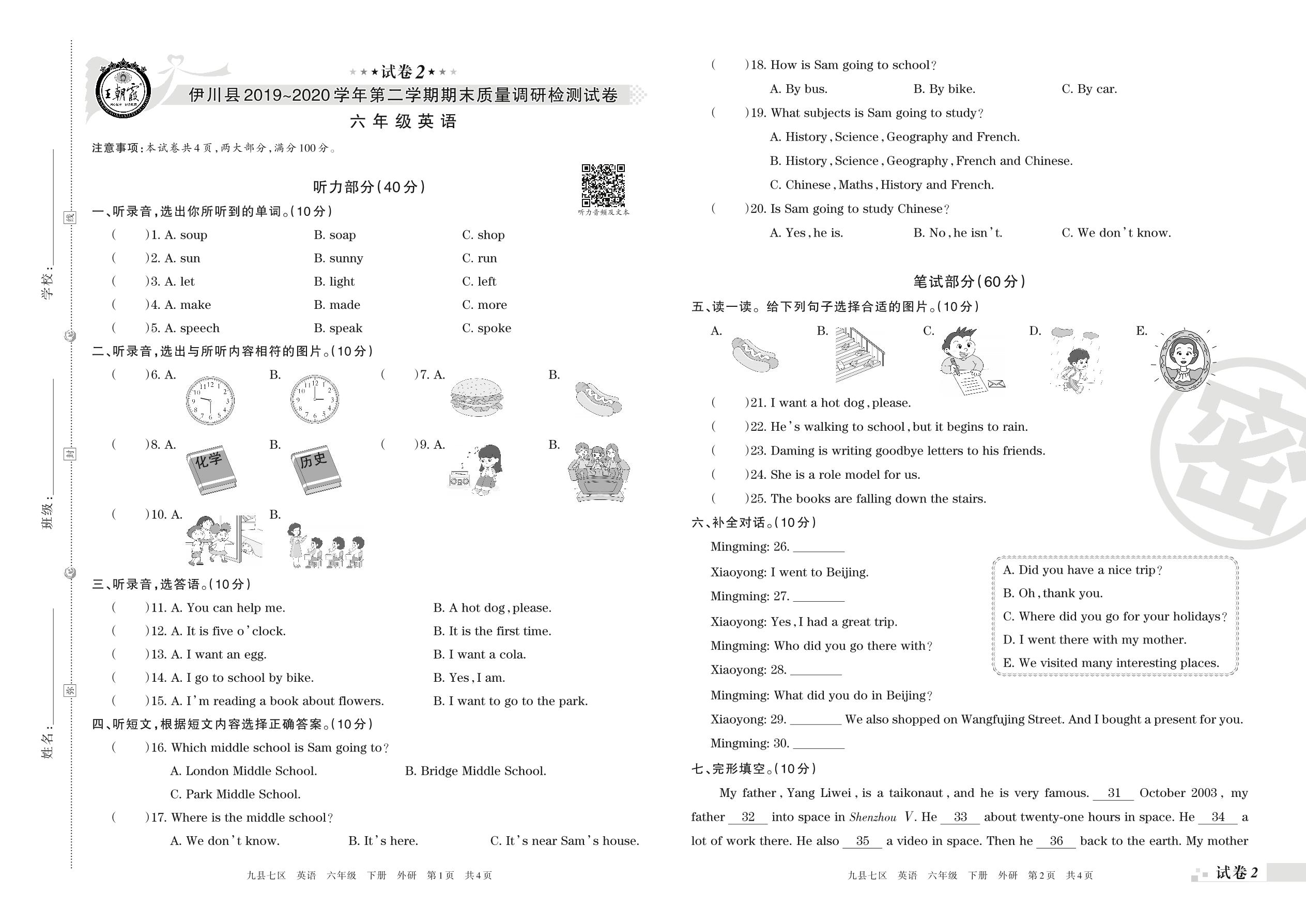 2019-2020学年第二学期洛阳市伊川县六年级英语试卷(外研版)【2】