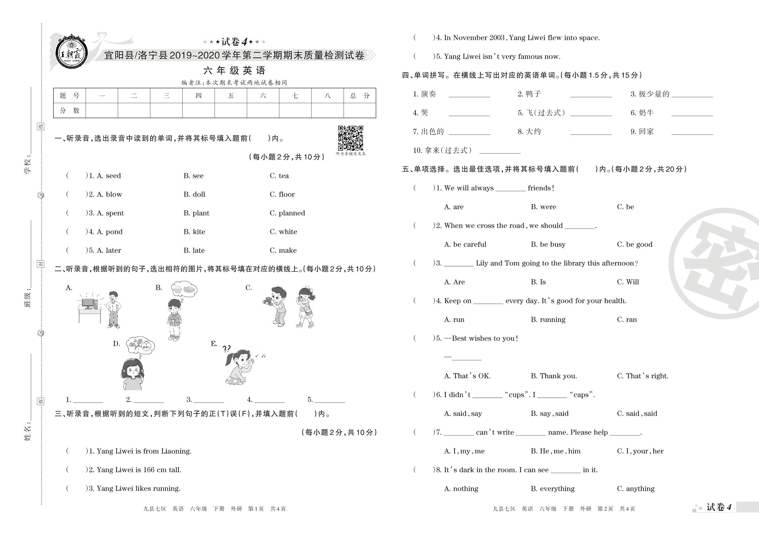 2019-2020学年第二学期洛阳市宜阳县、洛宁县六年级英语试卷(外研版)【4】