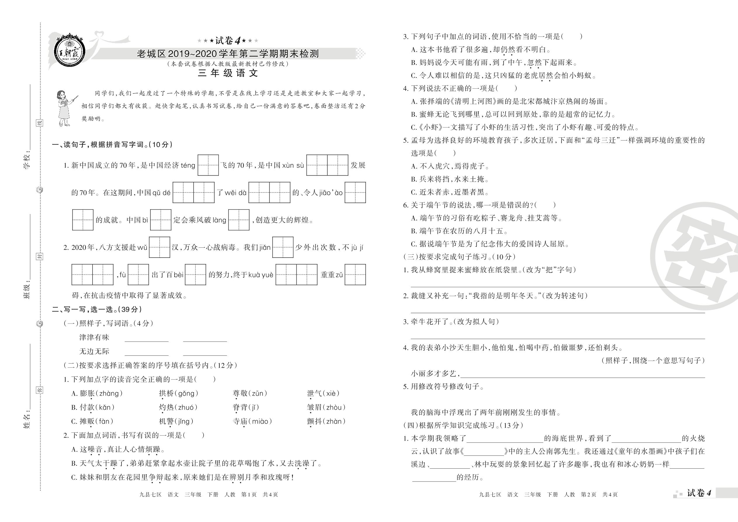 2019-2020学年第二学期洛阳市老城区三年级语文试卷(人教版)【4】
