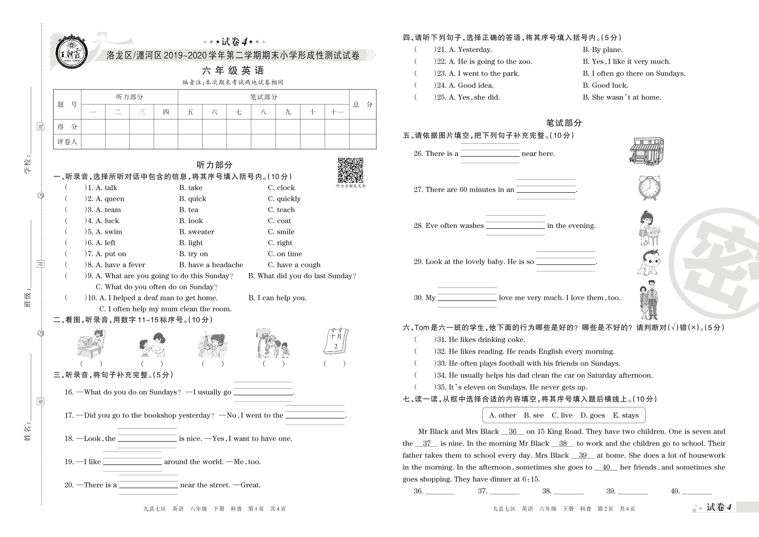 2019-2020学年第二学期洛阳市洛龙区、瀍河区六年级英语试卷(科普版)【4】